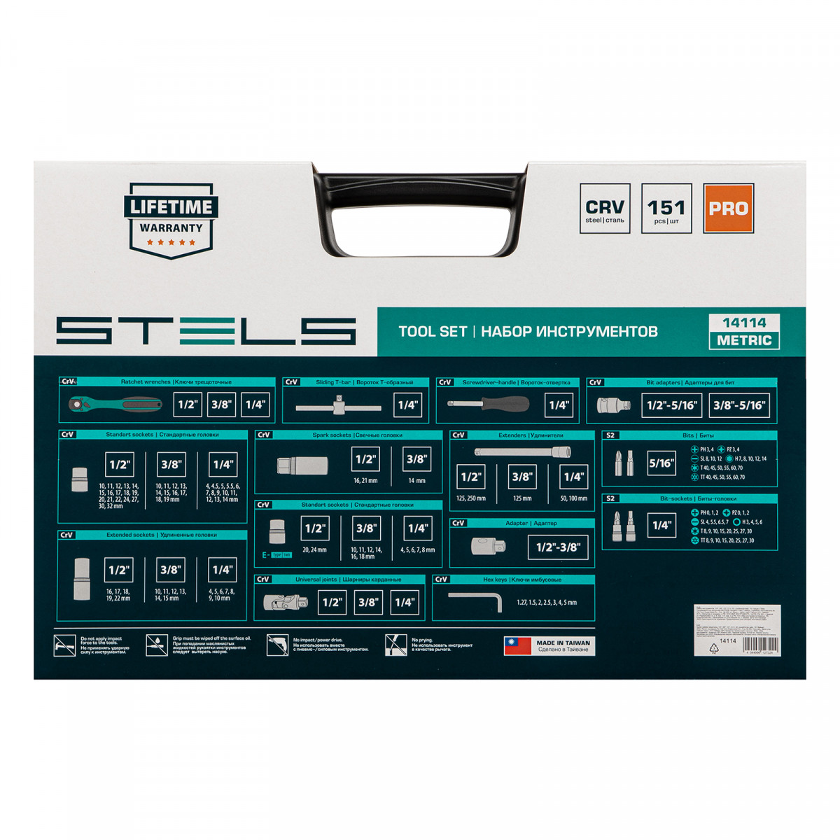 Набор инструментов Stels 14114 в ударопрочным пластиковом кейсе состоит из 151 предметов с присоединительными квадратами 1/2″ , 1/4″ и 3/8″, из стали CrV и S2, и предназначен для выполнения слесарно-монтажных работ. Включает инструменты и насадки для работы с резьбовыми крепежами, а также удлинители и т-образный вороток, облегчающие работу в труднодоступных местах. Набор предназначен для профессионального использования в автомастерской, будет полезен и для решения бытовых задач.