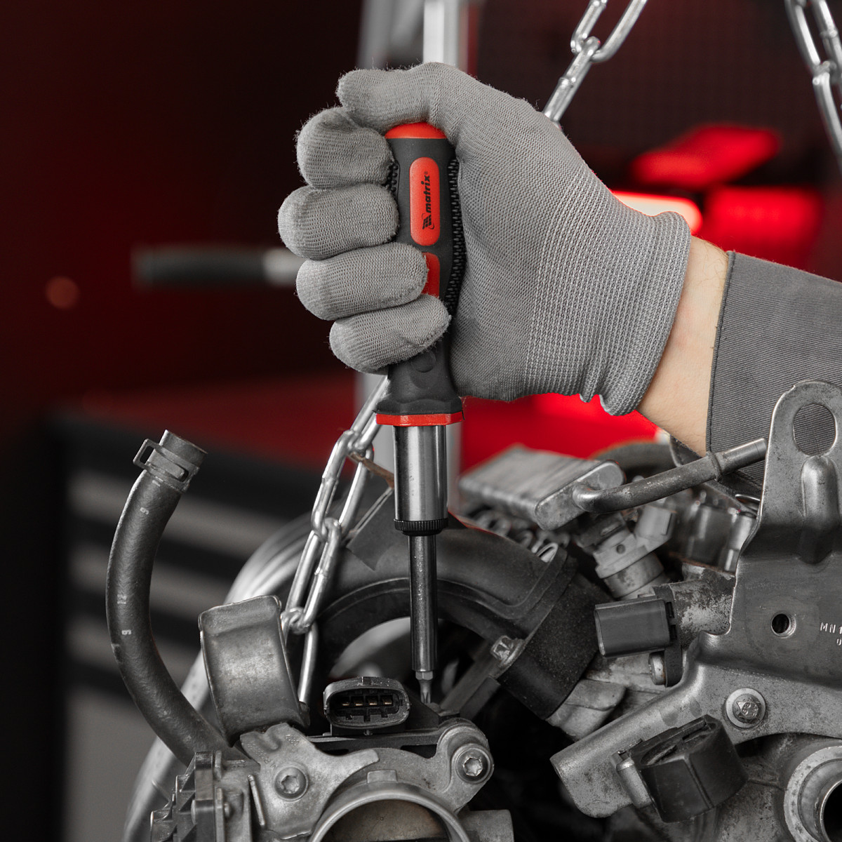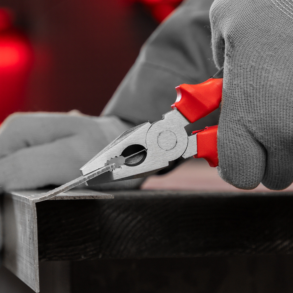 - За счет двухкомпонентных рукояток бокорезы, плоскогубцы и отвертка надежно лежат в руке и не проскальзывают, ограничительные упоры обеспечивают безопасную работу.