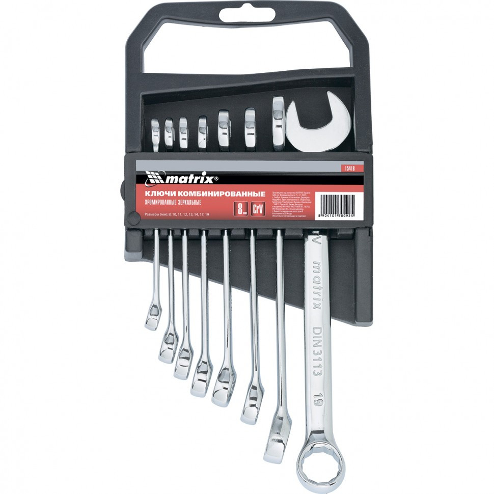 Набор комбинированных ключей 8 - 19 мм MATRIX 15418 обладает высокой прочностью и долговечностью. Данный набор состоит из восьми комбинированных ключей, которые изготовлены из хромванадиевой стали и имеют защитное хромоникелевое покрытие. Для удобства хранения этот набор поставляется в комплекте с трапециевидным пластмассовым держателем.