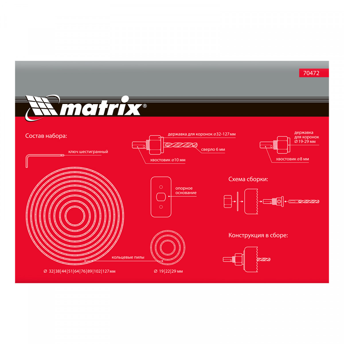Набор кольцевых пил Matrix 70472 из 12 предметов предназначен для работы по дереву и включает коронки диаметром 19-127 мм. Они устанавливаются на электродрели и служат для выпиливания круглых отверстий в фанере, гипсокартоне, ДСП, ДВП и ламинате. Малая и большая державки облегчают установку пил разного диаметра. В комплекте имеется специальная проставка, исключающая проворот коронки во время сверления. Набор пригодится во время ремонта — с его помощью можно прорезать отверстия под розетки, выключатели, светильники и трубы.