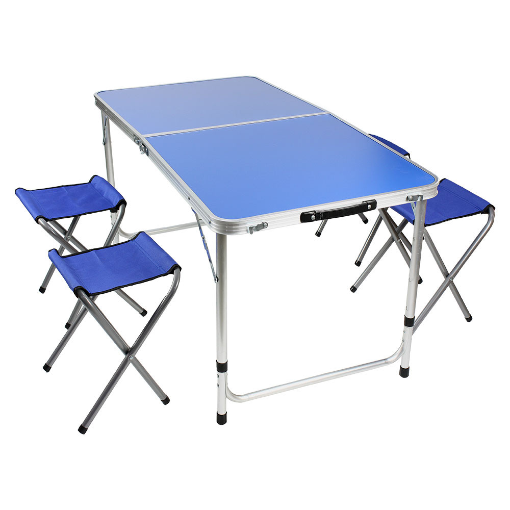 Складной столик отлично подойдёт для отдыха на открытом воздухе. Каркас изделия выполнен из металлической трубы — алюминиевого профиля. Столешница изготовлена из водостойкого пластика, который отличается долговечностью, поскольку устойчив к воздействию высокой температуры и повышенной влажности. Компактный стол не занимает много места при хранении. Удобная ручка поможет легко нести его в собранном виде. А стульчики помогают расслабиться и не искать место для сидения.Длина 60 см.