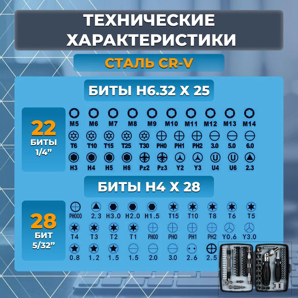Набор из стали CR-V обеспечивает высокую прочность и долговечность инструментов.