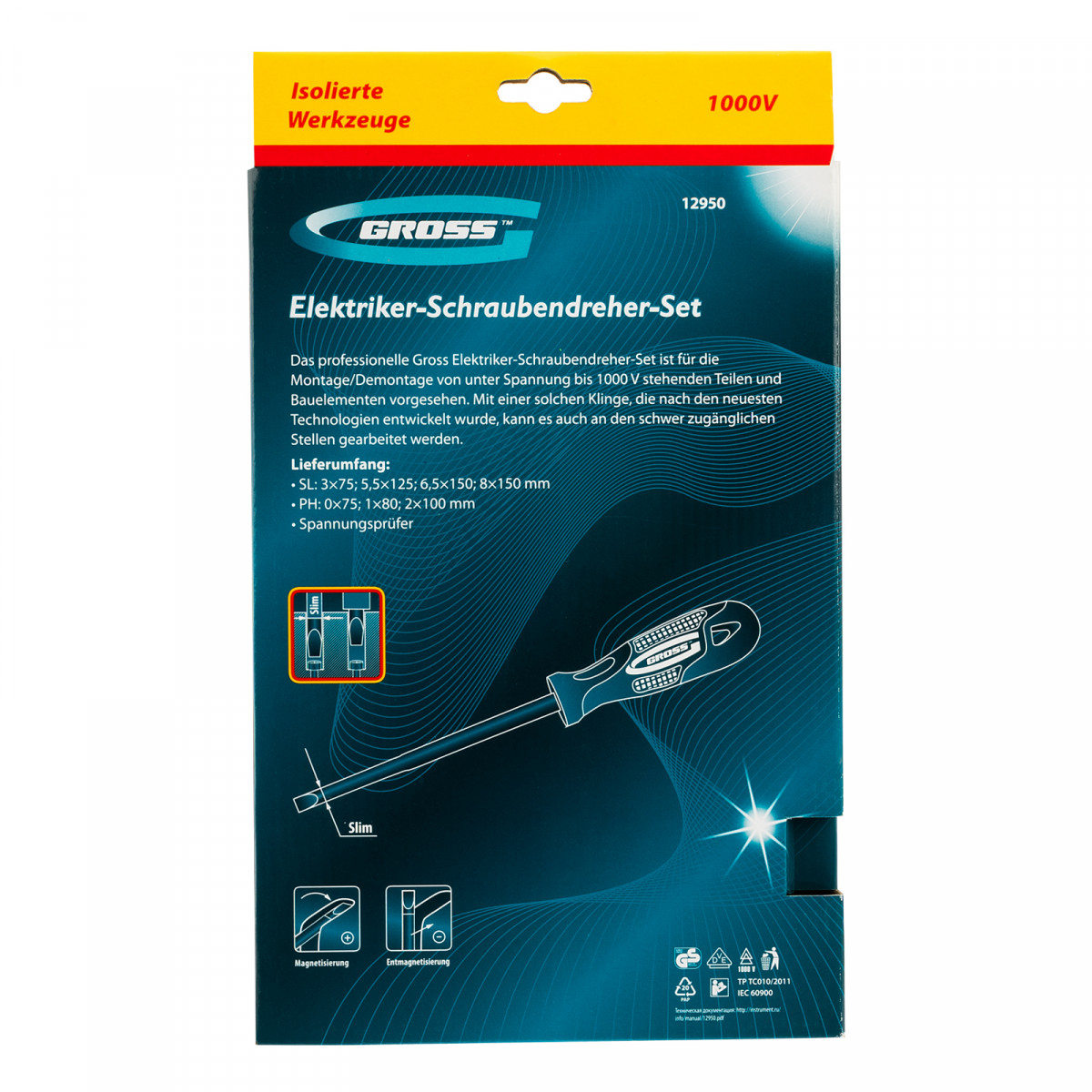 Набор отверток диэлектрических до 1000 В, 8 шт, тестер, CrMo, двухкомпонентные рукоятки Gross