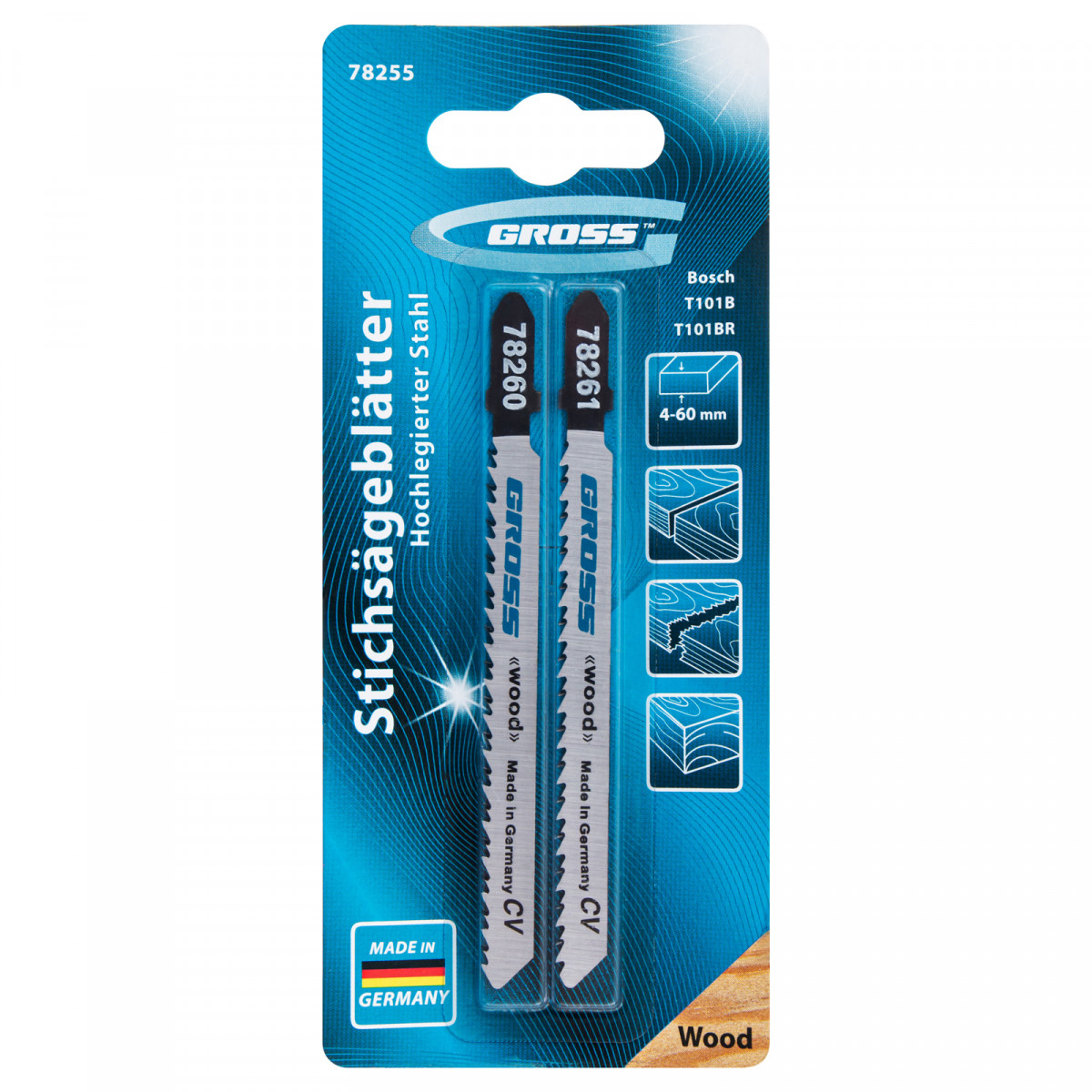 Набор полотен для электролобзика Gross 78255, 2шт. (T101B, T101BR), — это профессиональный инструмент для работ по дереву. Он рассчитан на распил древесины любых пород, а также фанеры, ДВП и пластика. Полотна позволяют осуществить чистый и быстрый рез. Благодаря длине 100 мм они справляются с распилом материалов толщиной 4-60 мм.