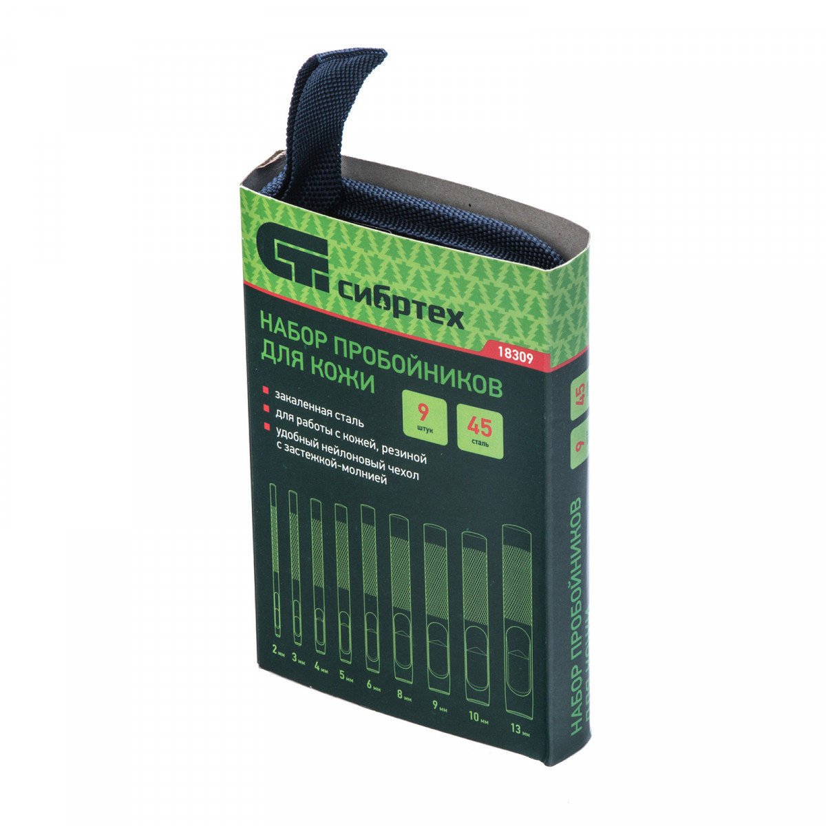 Набор пробойников для кожи Сибртех 18309, 9 шт. в чехле, позволяет пробить отверстия диаметром 2, 3, 4, 5, 6, 8, 9, 10 и 13 мм посредством ударного воздействия от киянки. Инструменты предназначены для работы с плотными материалами: кожей и резиной. Благодаря высокоточной прецизионной заточке режущих кромок пробойники выполняют ровный и качественный рез.
