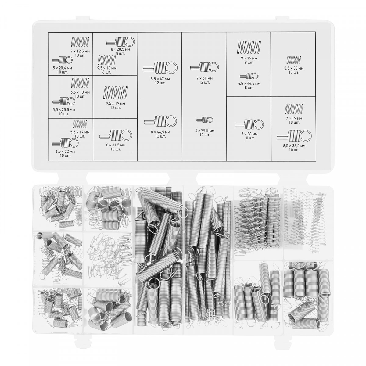 Пластиковый кейс - 1 штПружины растяжения: 4х79,5 мм - 12 шт4,5х44,5 мм - 8 шт5х20,4 мм - 10 шт5,5х25,5 мм - 10 шт6,5х22 мм - 10 шт7х38 мм - 10 шт7х51 мм - 12 шт8х28,5 мм - 8 шт8х31,5 мм - 10 шт8х44,5 мм - 12 шт8,5х36,5 мм - 10Чехол/кейс - 1 шт