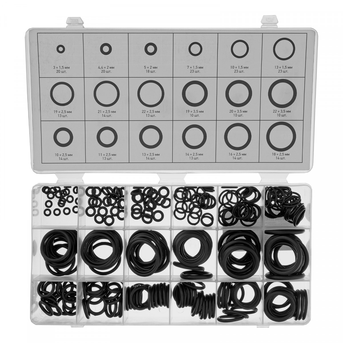 Пластиковый кейс - 1 штРезиновые уплотнители: 3х1,5 мм - 20 шт4,4х2 мм - 20 шт5х2 мм - 18 шт7х1,5 мм - 23 шт10х1,5 мм - 23 шт10х2,5 мм -14 шт11х2,5 мм -13 шт13х1,5 мм - 23 шт13х2,5 мм - 14 шт14х2,5 мм - 13 шт16х2,5 мм - 14 шт18х2