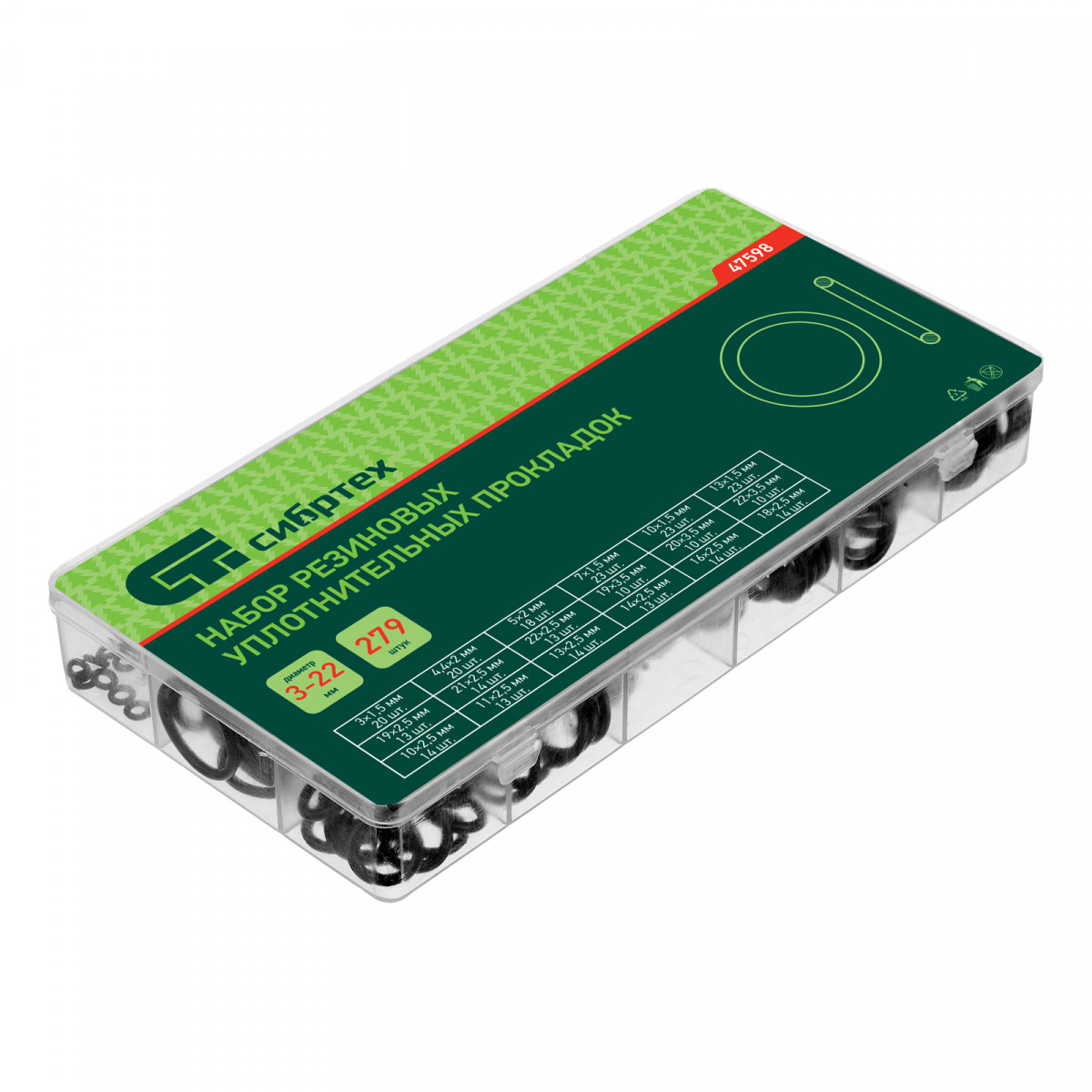 Набор Сибртех 47598 состоит из 279 резиновых уплотнительных прокладок с наружным диаметром от 3 до 23 мм и используется для создания герметичных конструкций. Позволяет решать широкий спектр задач, т. к. включает кольца наиболее часто встречающихся размеров. Прокладки используют для сантехнических и других ремонтных работ, а также в качестве уплотнительных резинок для автомобиля.
