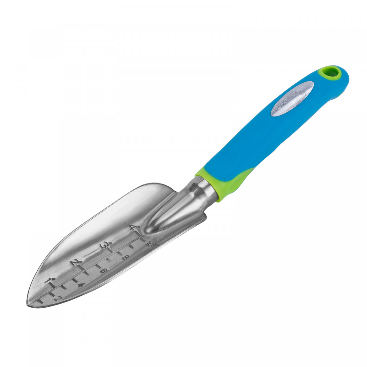 - Удобная эксплуатация — на рабочей части совка имеется мерная шкала, позволяющая контролировать глубину погружения в почву, зубья рыхлителя с заостренными кончиками легко проникают в грунт.