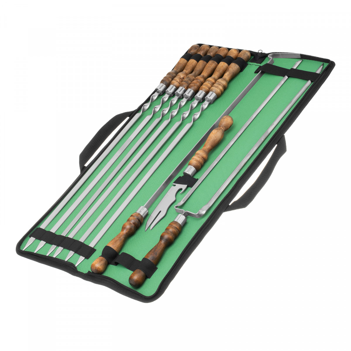 - Прочность и долговечность — элементы набора изготовлены из нержавеющей стали, шампуры увеличенной толщины 2,5 мм не сгибаются и не деформируются под тяжестью продуктов.