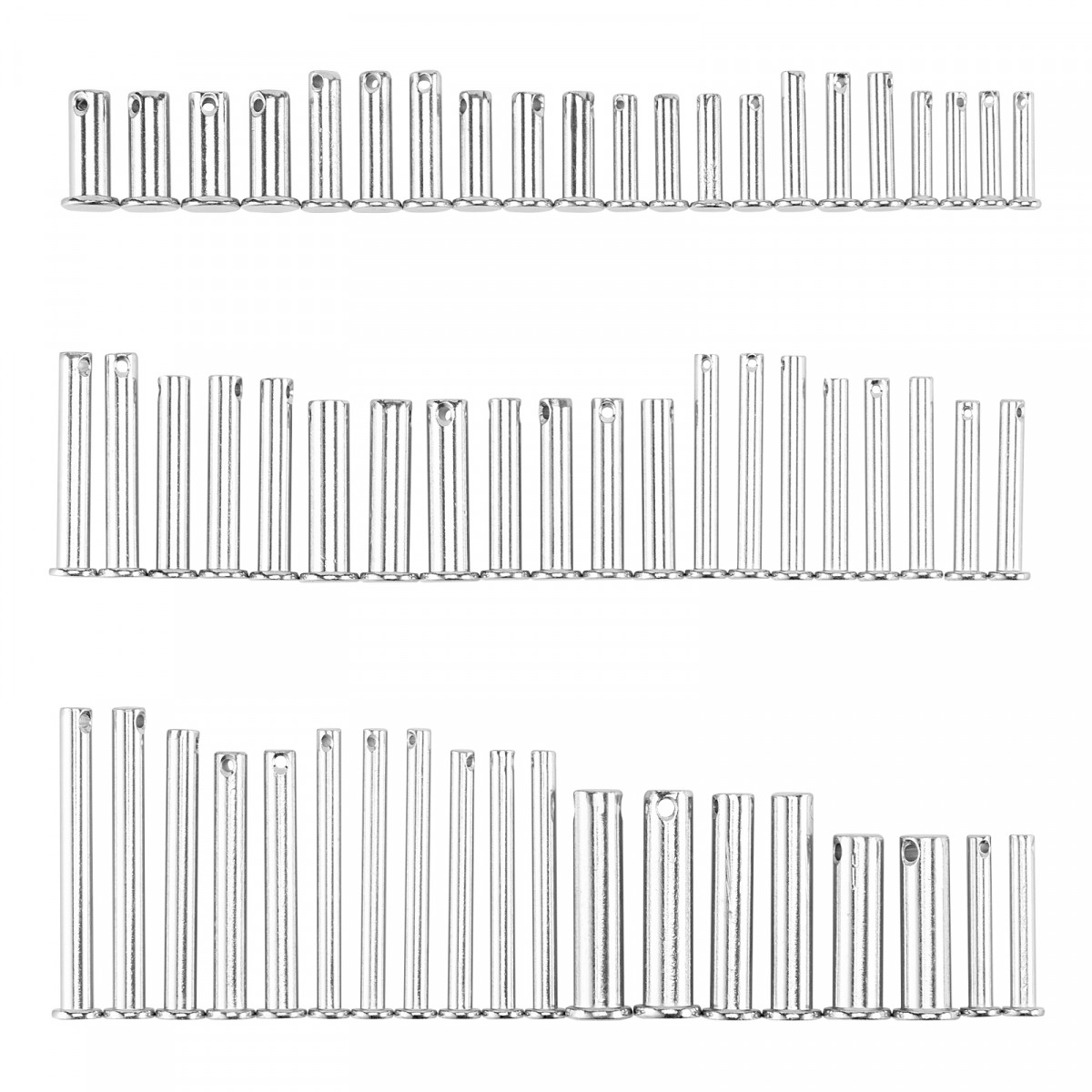 Набор Сибртех 47612 включает 60 штифтов с головкой и отверстием под шплинт, предназначенных для неподвижного соединения деталей. В корпусе каждого штифта имеется отверстие, позволяющее использовать шплинт для надежной фиксации крепежа.