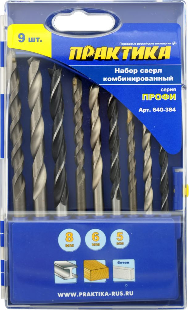 Набор сверл комбинированный ПРАКТИКА "профи", 9шт металлу/бетону/дереву 5,6,8 мм ПРО кассета