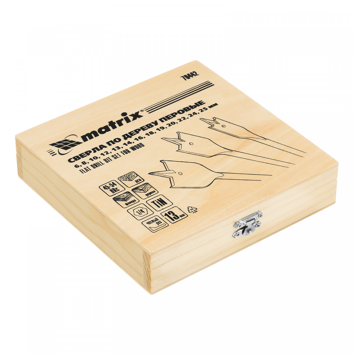 Набор сверл перовых по дереву, 6-8-10-12-13-14-16-18-19-20-22-24-25 мм, 13 шт, деревянный кейс Matrix