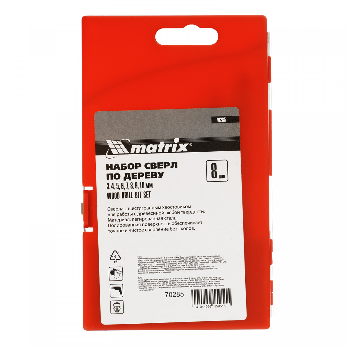 Набор сверл по дереву, 3-4-5-6-7-8-9-10 мм, 8 шт, шестигранный хвостовик, пластиковый кейс, Matrix