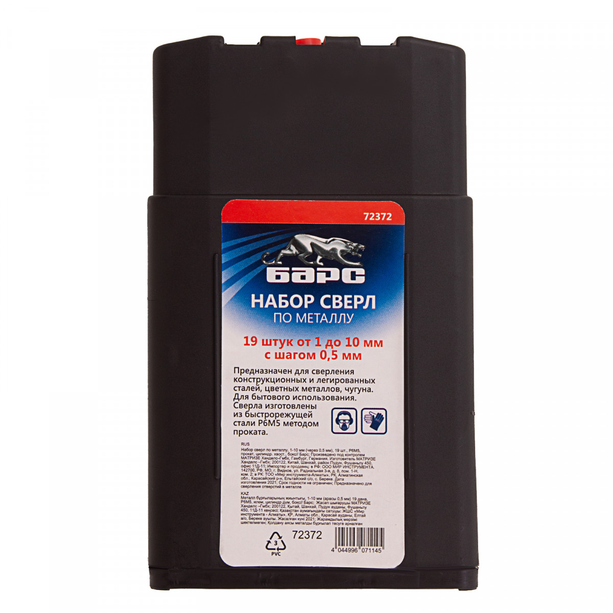 Набор сверл по металлу, 1-10 мм (через 0.5 мм) 19 шт, Р6М5, прокат, цилиндрический хвостовик Барс
