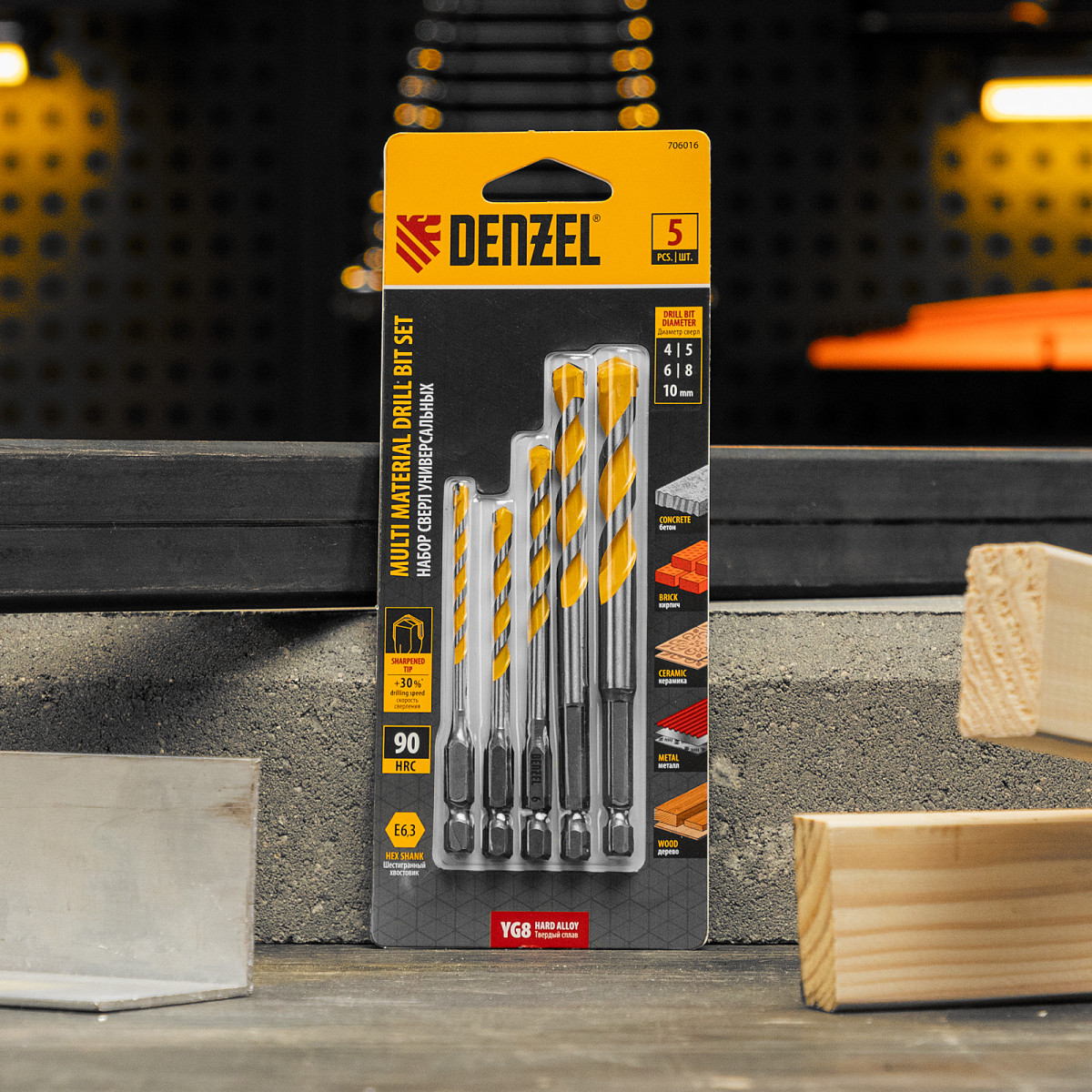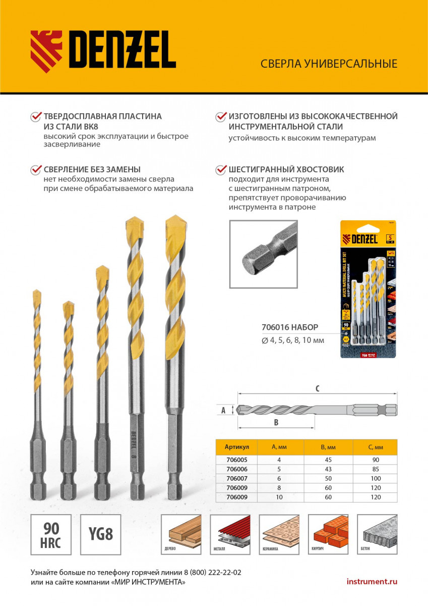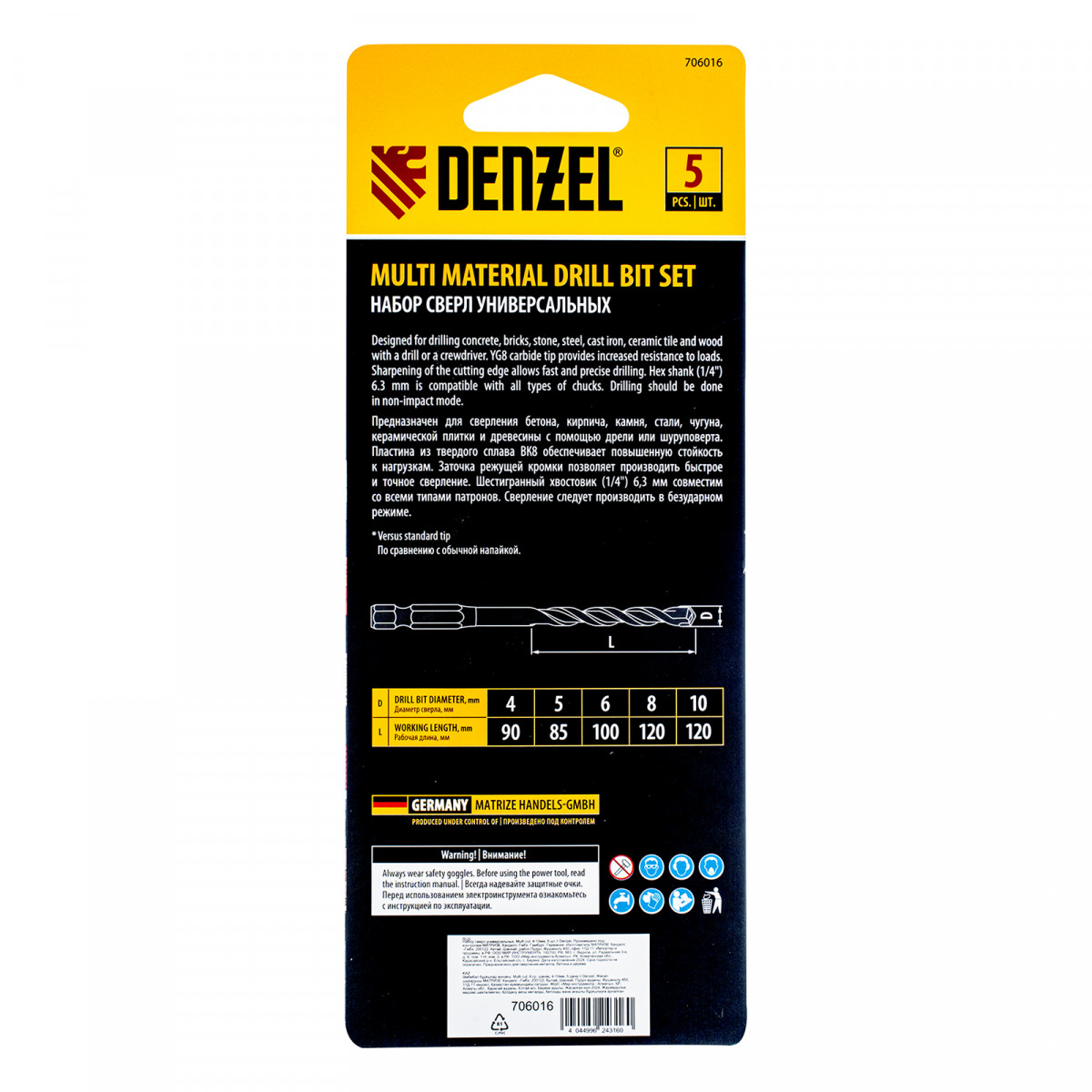 Набор универсальных сверл Denzel Multi Cut 706016, 5 штук, предназначен для получения отверстий диаметром 4-10 мм в бетоне, металле, керамике, древесине любых пород, фанере, пластмассе и других материалах. Будет полезен в быту и профессиональной сфере.