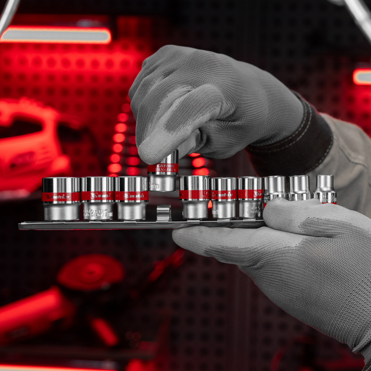 - Быстрый поиск нужной торцевой головки — на корпусах насадок имеются красные полоски и маркировка с обозначением размера.