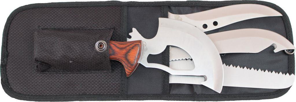 Набор туристический «Следопыт» включает в себя: - пила - 220 х 32 мм; - нож - 200 х 30 мм; - нож - 170 х 25 мм; - топорик - 150 х 63 мм.Габаритные размеры: 225 х 120 х 30 мм.