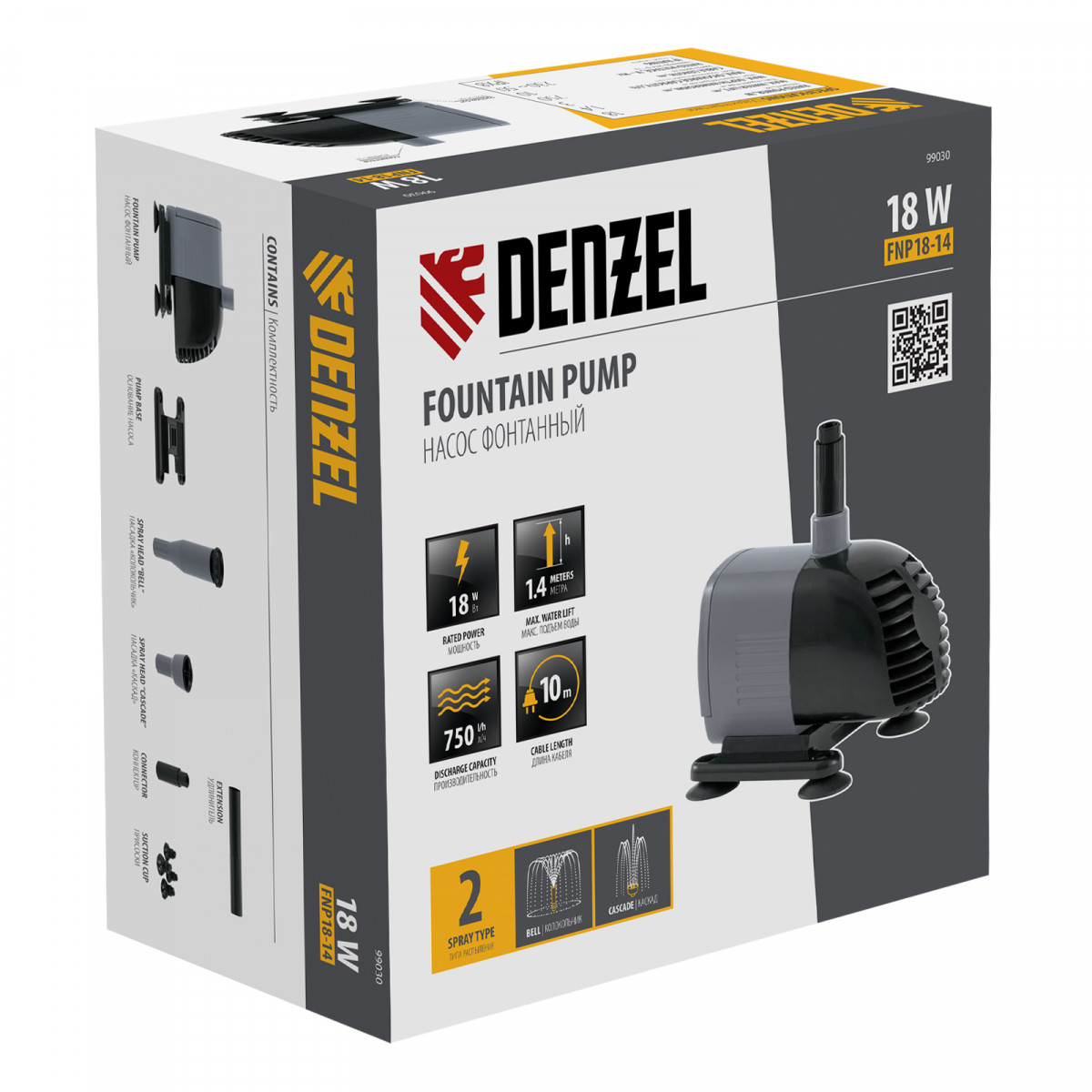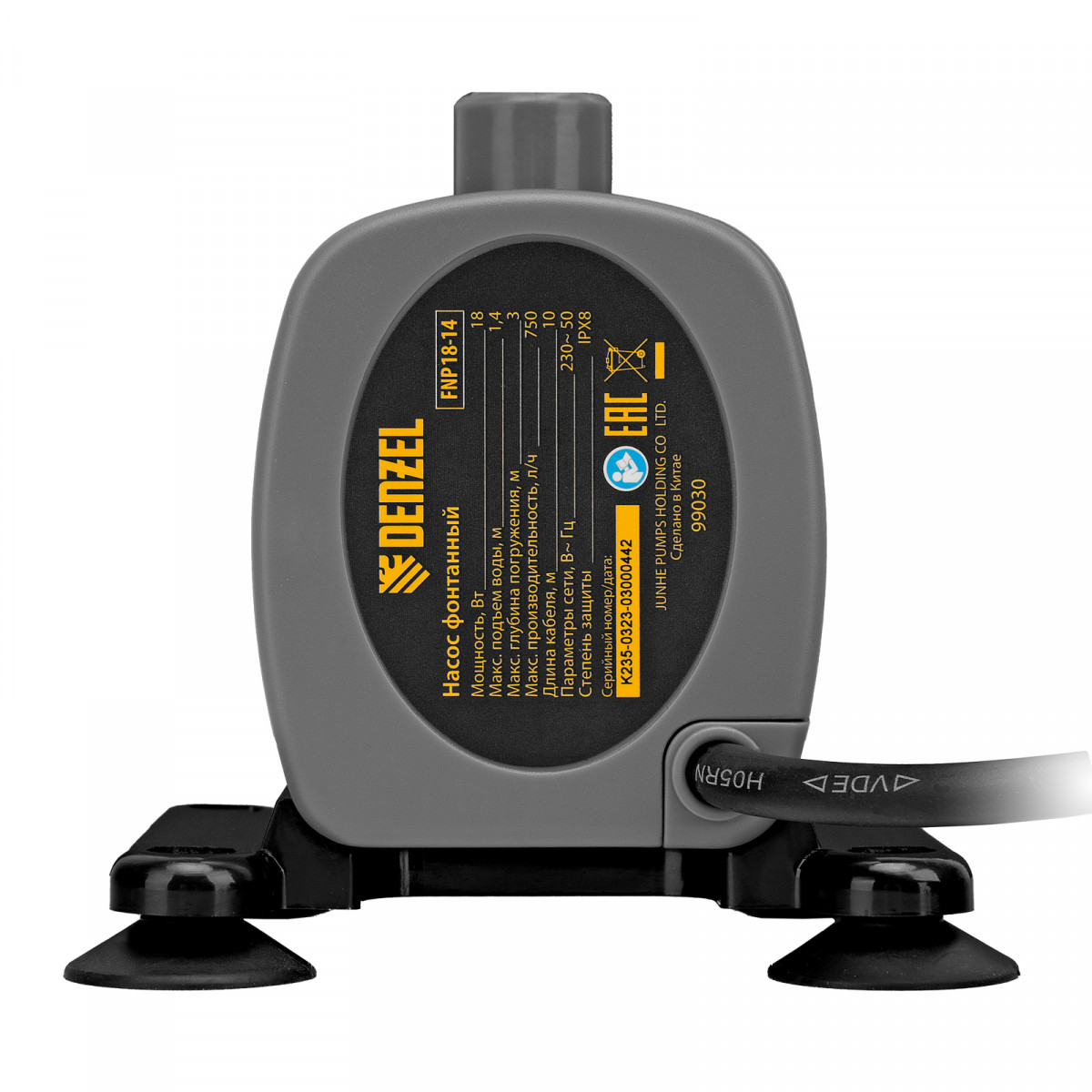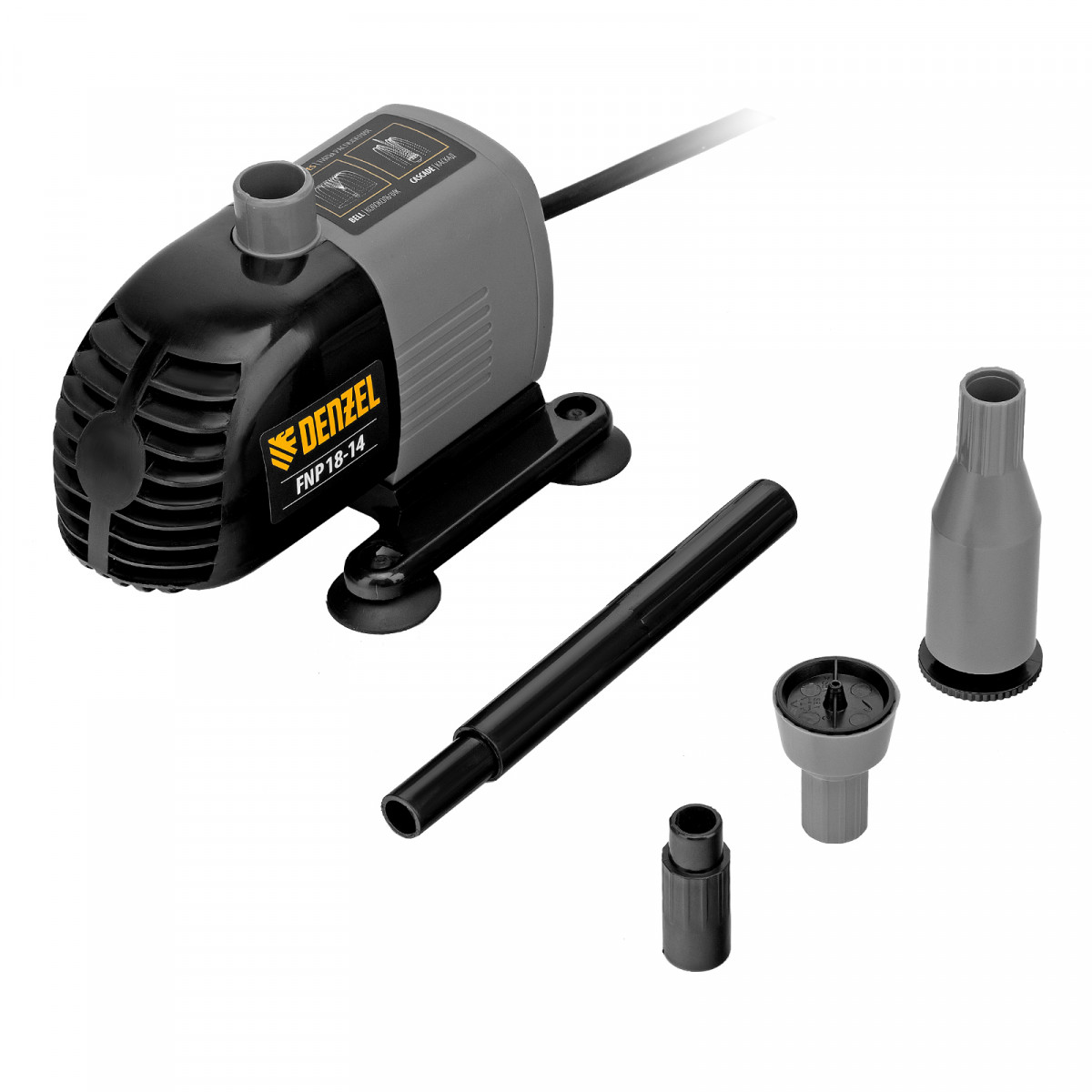 Насос фонтанный FNP18-14, 18 Вт, подъем 1,4 м, 750 л/ч, колокольчик/каскад Denzel