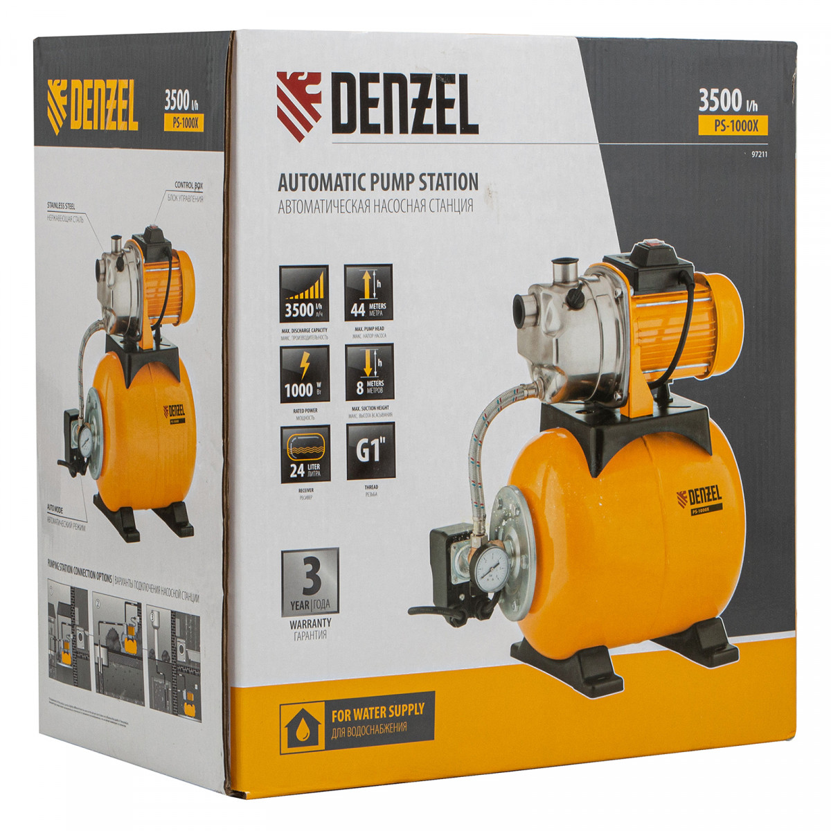 Насосная станция Denzel PS1000X 97211 мощностью 1000 Вт выполнена из нержавейки, оснащена ресивером на 24 л, обеспечивает производительность до 3500 л/ч и подъем воды до 44 м. Рассчитана на бытовое использование в загородных домах, квартирах и на дачах. Мощности 1 кВт вполне хватит для подключения устройства к оросительным системам, перекачивания воды в частный дом, обеспечения отопительных нужд и т.д. Станция не требует постоянного контроля со стороны пользователя, поскольку работает в автоматическом режиме. Благодаря ресиверу на 24 л в случае отключения электричества в доме всегда будет запас воды на нужды первой необходимости.