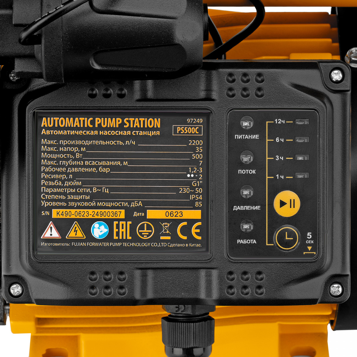 • Плавный пуск — станция запускается через 3 секунды после подключения питания, такое решение позволяет защитить двигатель и снизить нагрузку на электросеть.