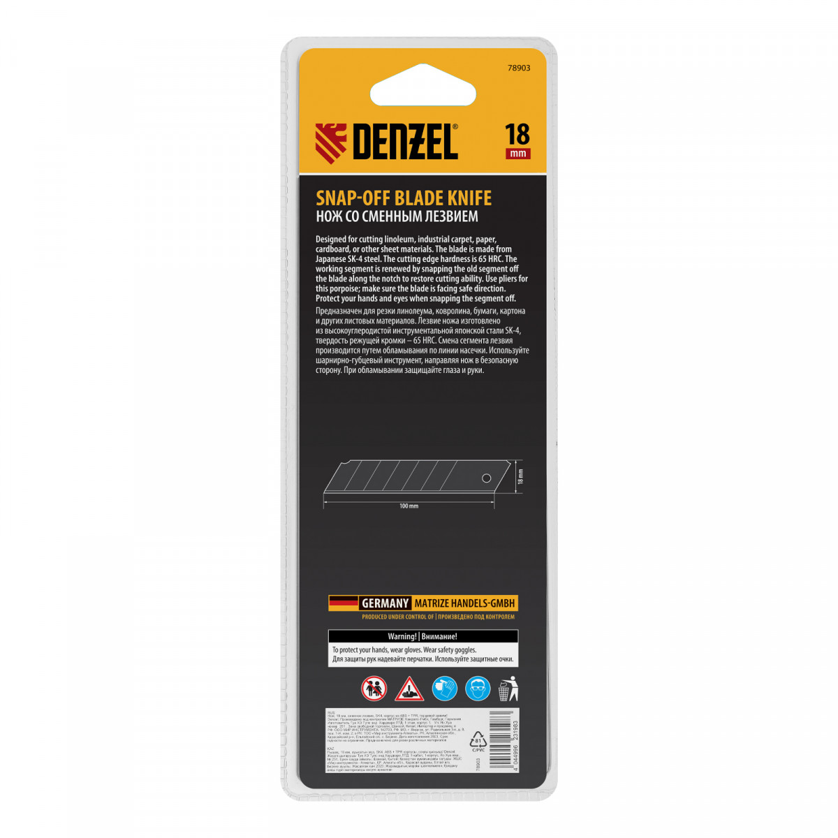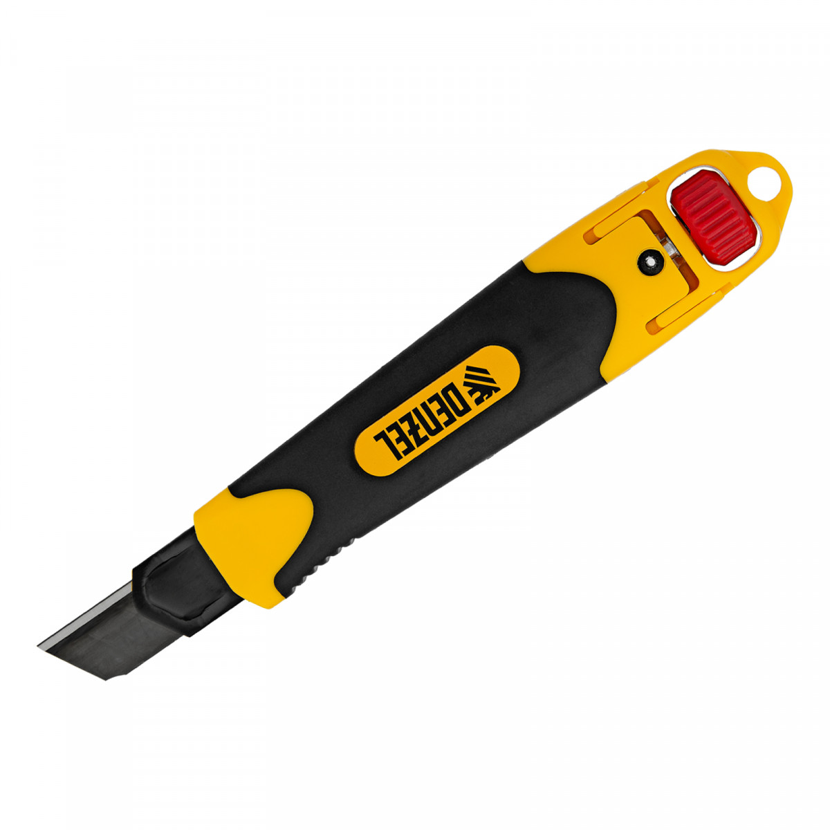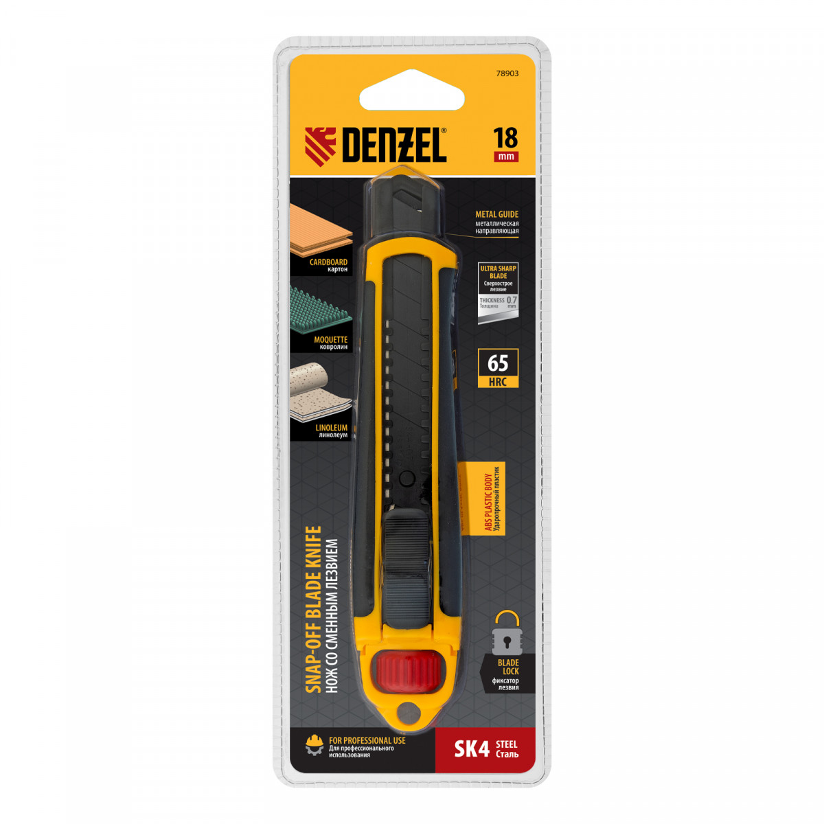 Нож, 18 мм, сменное лезвие, SK4, корпус из ABS + TPR, торцевой зажим Denzel