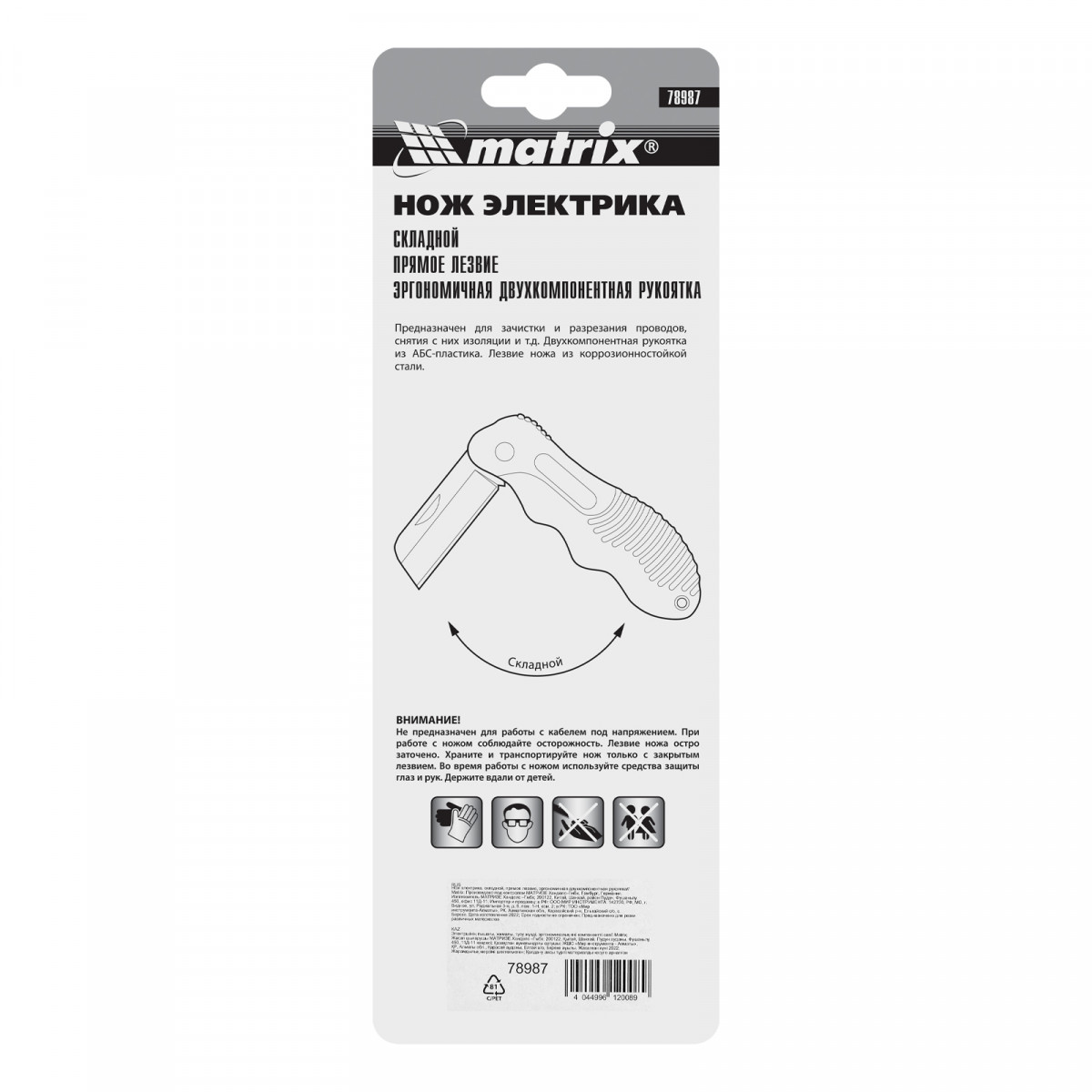Нож электрика, складной, прямое лезвие, эргономичная двухкомпонентная рукоятка Matrix