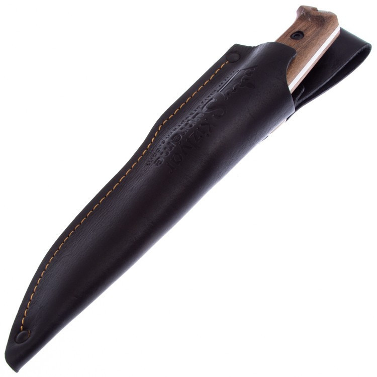Рукоять выполнена из стабилизированной древесины ореха. Дерево является одним из самых традиционных и распространенных материалов для рукоятей ножей. Основным плюсом древесины является то, что, благодаря своей текстуре, она позволяет без особых усилий практически любую художественную форму рукояти. Традиционно используется на охотничьих ножах.
