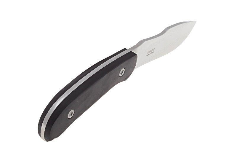 Клинок выполнен из AUS-8 — это нержавеющая сталь японского производства. Она хорошо выдерживает ударные нагрузки и быстро точится. Но с другой стороны, заточку держит средне и нуждается в частой правке. Спуски на клинке идут вогнутые, такой нож будет хорошо вгрызаться в материал и им будет удобно строгать, но контролировать рез будет сложнее.