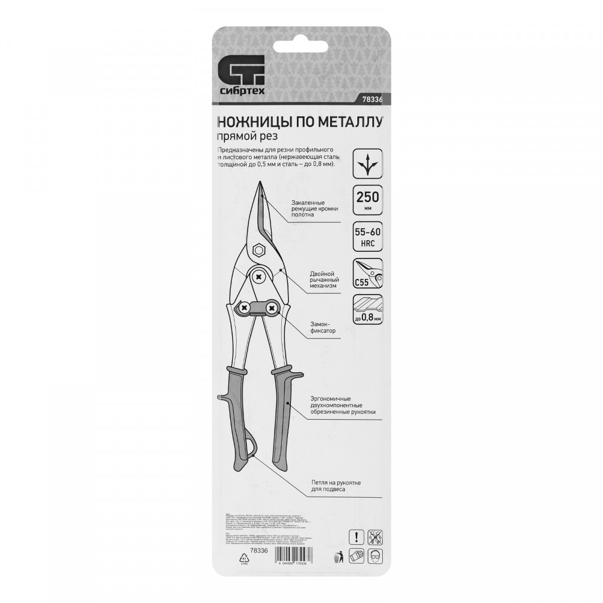 Ножницы Сибртех 78336 длиной 250 мм, из стали С55, с двухкомпонентными рукоятками, используются для прямого реза профильного и листового металла. Предназначены для проведения ремонтных и монтажных работ с материалами толщиной до 0,8 мм.