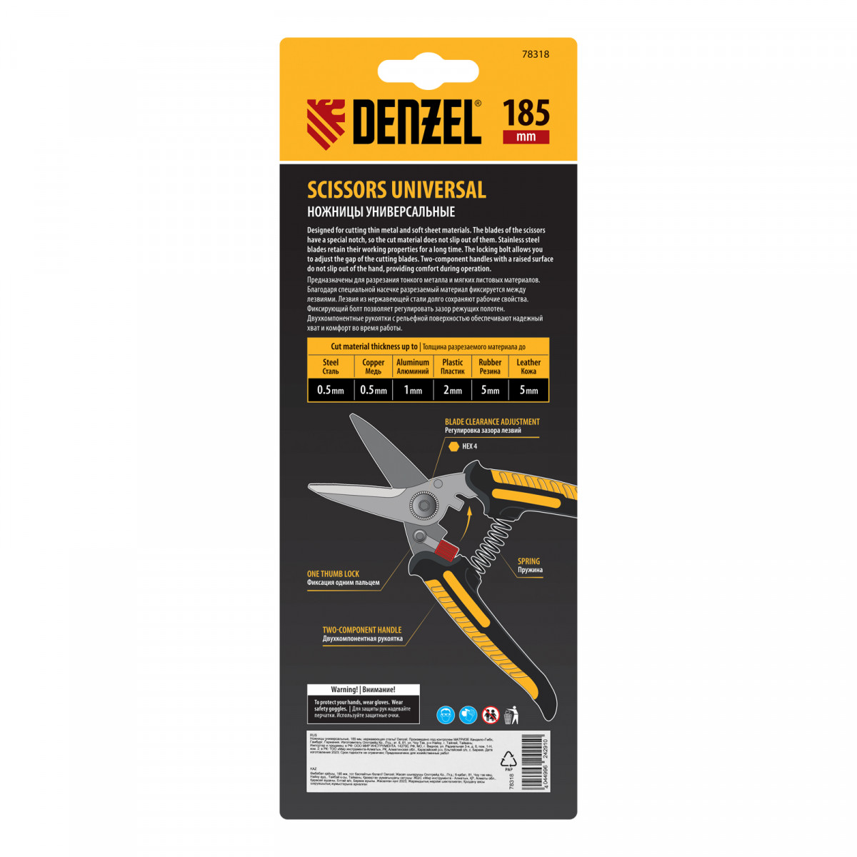 Универсальные ножницы Denzel 78318 длиной 185 мм — инструмент для разрезания тонкого металла и мягких материалов. Одно из лезвий имеет серрейторную (зубчатую) заточку, поэтому разрезаемый материал не выскальзывает из инструмента. Ножницы подходят для выполнения разнообразных работ: на даче помогут разрезать стальную сетку с небольшим диаметром проволоки, в походе — ветки или рыбу, во время мелкого ремонта или занятий творчеством — провода, кожу, резину, картон, бумажную лозу и другие материалы.