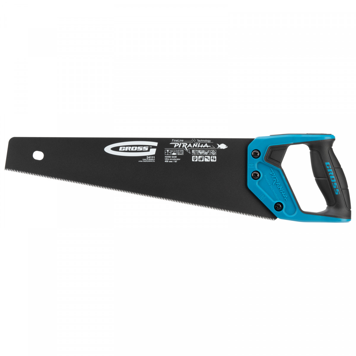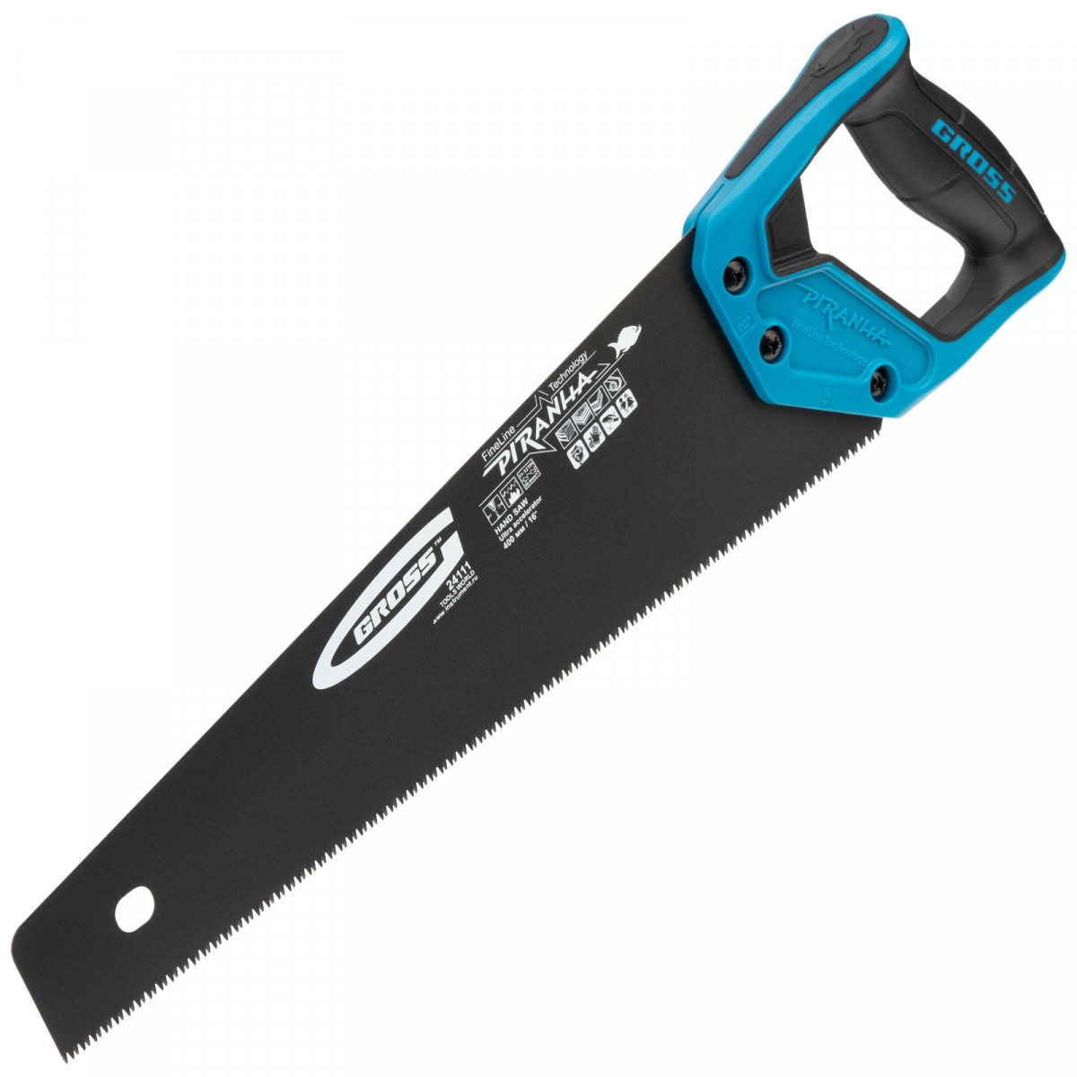 Ножовка по дереву Gross PIRANHA 24111 с полотном длиной 400 мм, калеными зубьями с 3D-заточкой и шагом 11-12 TPI, тефлоновым покрытием полотна и 2-компонентной рукояткой, используется для продольного и поперечного распиливания древесины различных пород, МДФ, ДСП, ДВП, ламината, а также пенополистирола, полиуретана и других синтетических материалов. Рабочая часть состоит из мелких зубьев с шагом 2-2,3 мм, что позволяет получить ровный и чистый рез. Трехгранная заточка зубьев увеличивает производительность инструмента без потери качества распиловки. Ножовка предназначена для столярных работ.