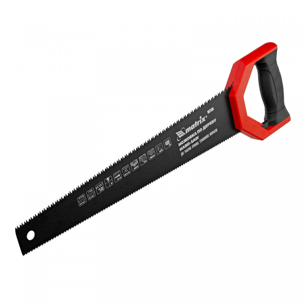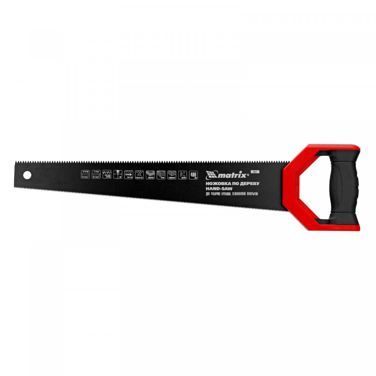 Ножовка по дереву Matrix UNIVERSAL 23571 с полотном длиной 400 мм и закаленными зубьями c заточкой 3D и 2D имеет две рабочие кромки с шагом зубьев 13-14 TPI и 7-8 TPI. Может применяться для выполнения столярных и плотницких работ разной степени точности. Мелкие зубья с 2D-заточкой обеспечивают ровный и точный рез в направлении от себя и к себе. Режущая кромка с шагом зубьев 7-8 TPI и с 3D-заточкой используется для быстрой и чистой распиловки. Ножовкой можно пилить древесину, фанеру, ДСП.