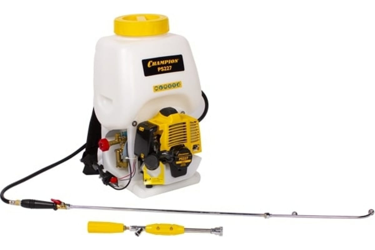 Опрыскиватель Champion PS227 применяется для распыления различных химикатов и удобрений на сельскохозяйственных участках и в саду.Удобство транспортировки. Наплечный ремень регулируется по росту и фигуре и позволяет без труда переносить опрыскиватель.Простота использования. Струйная трубка с удлинителем позволяет легко регулировать направление струи и распылять жидкость на большие расстояния.Многофункциональность. Возможно два вида распыления - с помощью струйной трубки или пистолета-распылителя для оптимальной работы.