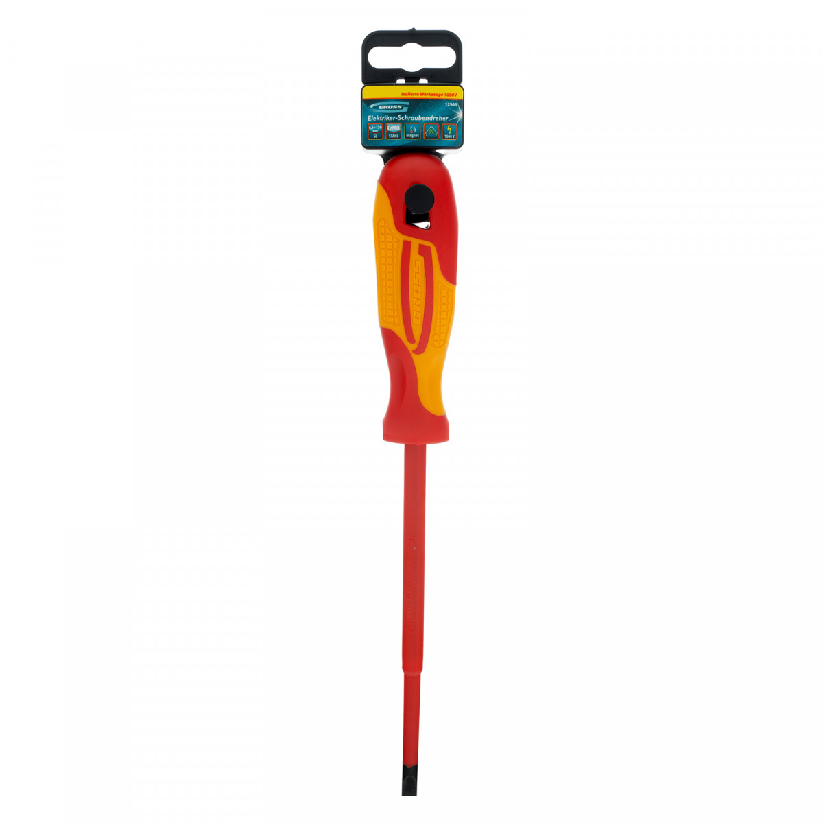 Диэлектрическая отвертка Gross 12944, SL6,5 х 150 мм, из стали CrMo, до 1000 В,с двухкомпонентной рукояткой, позволяет решать профессиональные задачи при работе с электрооборудованием. Отверткой со шлицем «минус» осуществляется монтаж или извлечение крепежа типа Slotted при замене розеток, установке электросчетчиков, клеммников и т.д. За счет стержня длиной 150 мм инструмент подходит для работы в углублениях и с легкодоступным крепежом. Внимание — техника безопасности запрещает выполнять работы под напряжением!