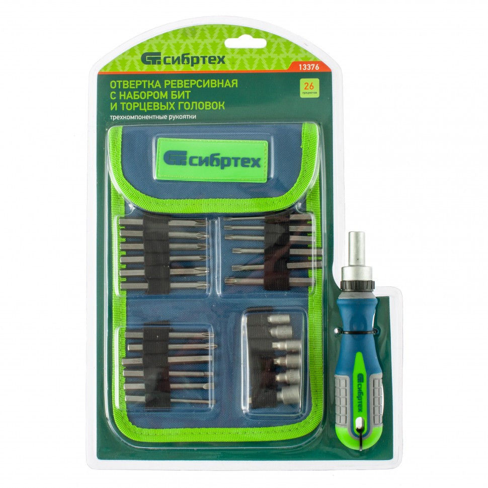 Отвертка реверсивная с набором бит и торцевых головок СИБРТЕХ 26 шт, CrV, чехол