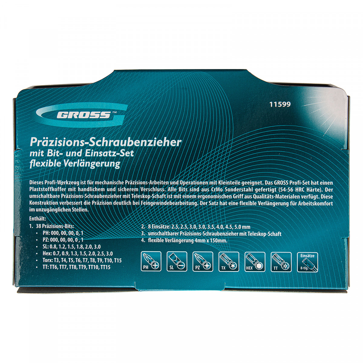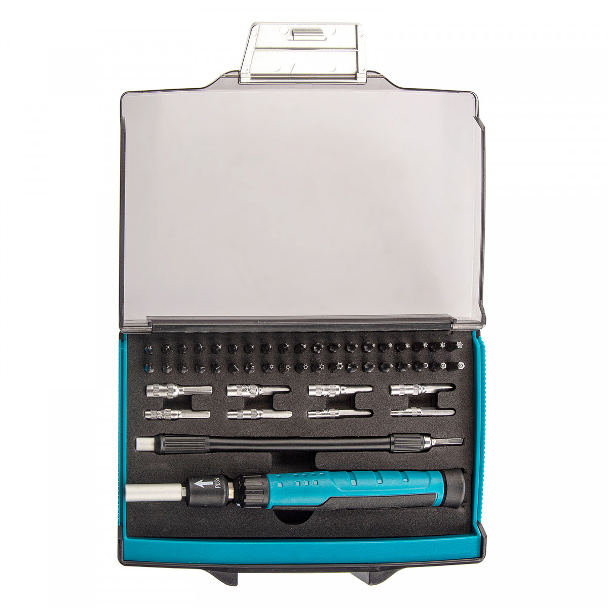 Пластиковый кейс - 1 штБиты для точных работ PH: 000, 00, 00, 0, 1 - 5 штБиты для точных работ PZ: 000, 00, 00, 0, 1 - 5 штБиты для точных работ SL: 0.8, 1.2, 1.5, 1.8, 2.0, 3.0 - 5 штБиты для точных работ Hex: 0.7, 0.9, 1.3, 1.5, 2.0, 2.5, 3.0 - 7 штБиты для точных работ Torx: T3, T4, T5, T6, T7, T8, T9, T10, TT6, TT7, TT8, TT9, TT10, TT15 - 14 штТорцевые головки: 2.5, 2.5, 3.0, 3.0, 3.5, 4.0, 4.5, 5.0 мм - 8 штТелескопическая реверсивная отвертка для точных работ - 1 штГибкий удлинитель 4 мм x 150 мм - 1 шт