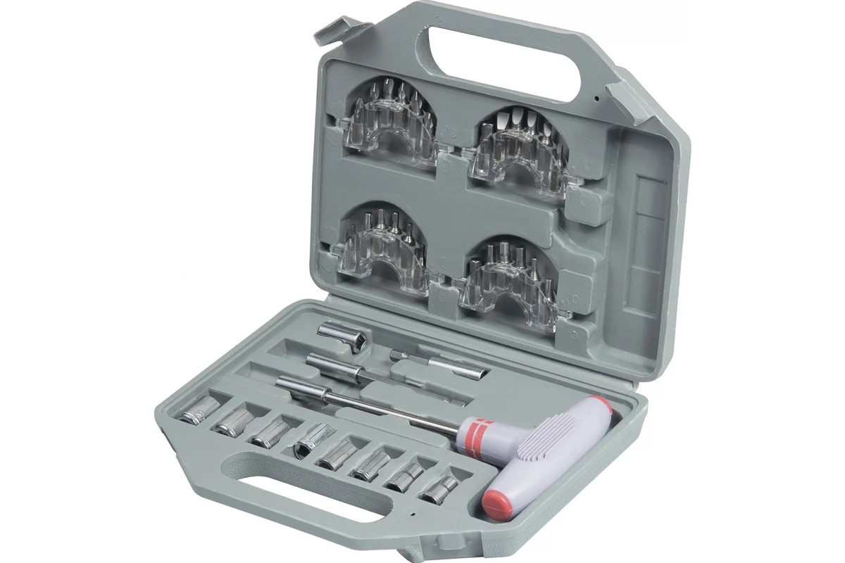 Комплект инструментов упакован в специальный закрывающийся пластиковый кейс с ручкой, где для каждого предмета установлено свое место.