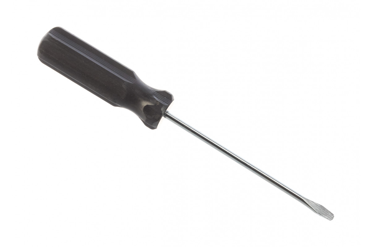 Отвертка , из углеродистой стали, с черной пластиковой рукояткой, предназначена для бытового применения. С ее помощью можно произвести монтаж или демонтаж крепежных элементов со шлицами Slotted. Отвертка имеет стержень 75 мм для работы в углублениях и с легкодоступным крепежом.