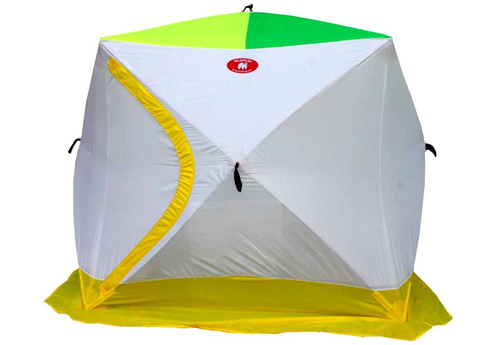 Палатка для зимней рыбалки Куб-3 быстро собирается, надежная, прочная, непродуваемая. Имеет два входа, расположенных по диагонали, что очень удобно.