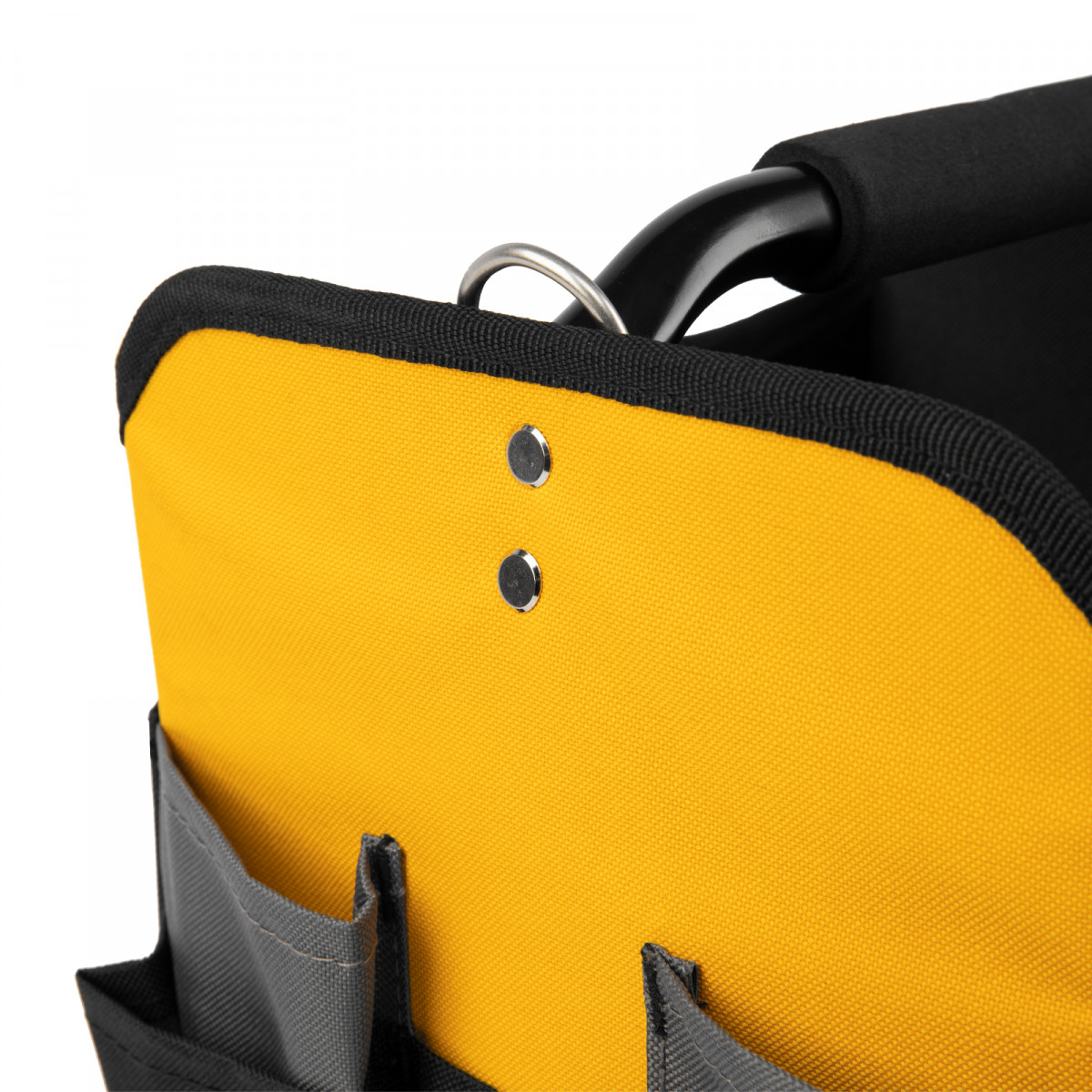 Переноска Denzel 90294 габаритами 260 х 240 х 300 мм, с наплечным ремнем, имеет вместительное основное отделение и 22 кармана. В ней можно разместить ручной и электроинструмент для хранения и транспортировки. Переноска пригодится в дороге, дома или в гараже.