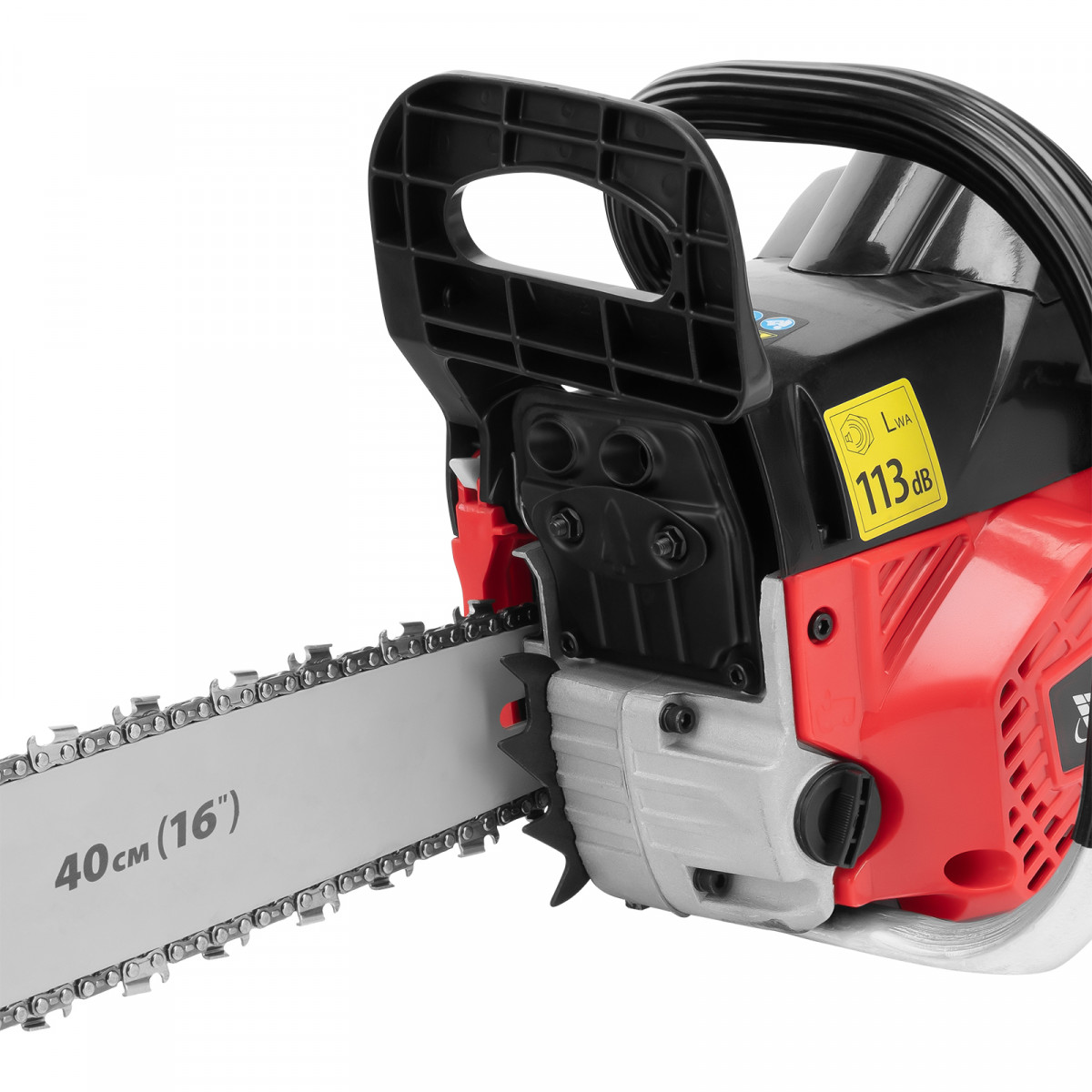 • Безопасная эксплуатация — функция блокировки газа предотвращает случайный запуск, тормоз цепи снижает риск травмирования при отскоке пилы.