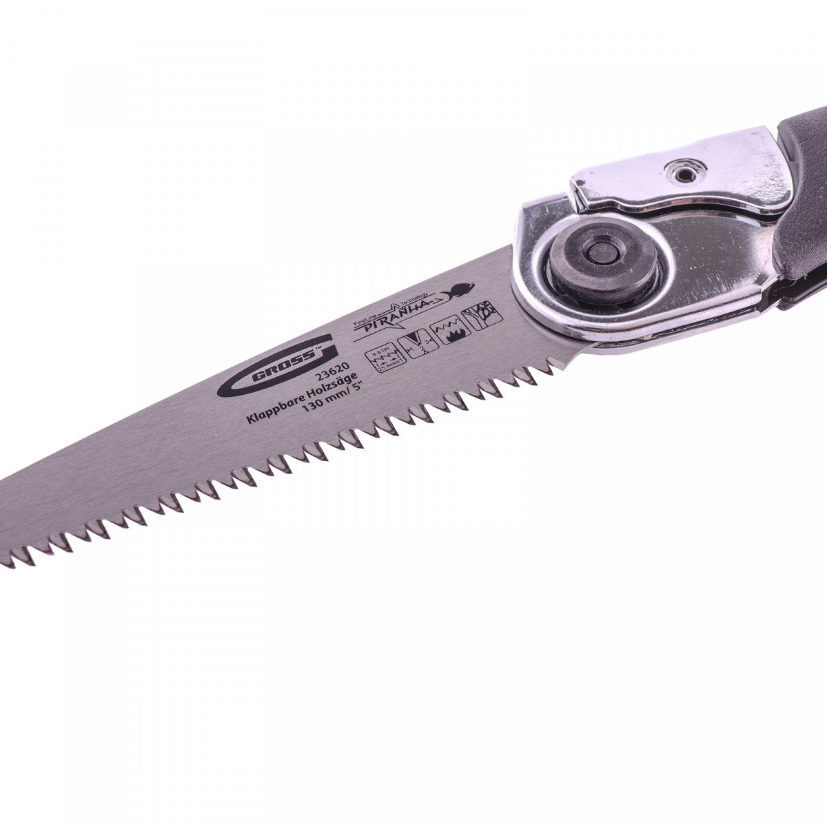 Складная пила по дереву Gross PIRANHA 23620 с полотном длиной 130 мм, калеными зубьями с 3D-заточкой и шагом 8-9 TPI, с обрезиненной рукояткой, в кобуре, предназначена для кемпинга и работы в саду. Подходит для продольного и поперечного пиления древесины. Зубья с трехгранной заточкой и шагом 8-9 TPI обеспечивают быструю распиловку. Пила легко складывается, поэтому ее можно брать с собой в поездку, поход или на пикник, не опасаясь пораниться в процессе транспортировки. В комплект входит чехол-кобура, которую можно повесить на ремень.