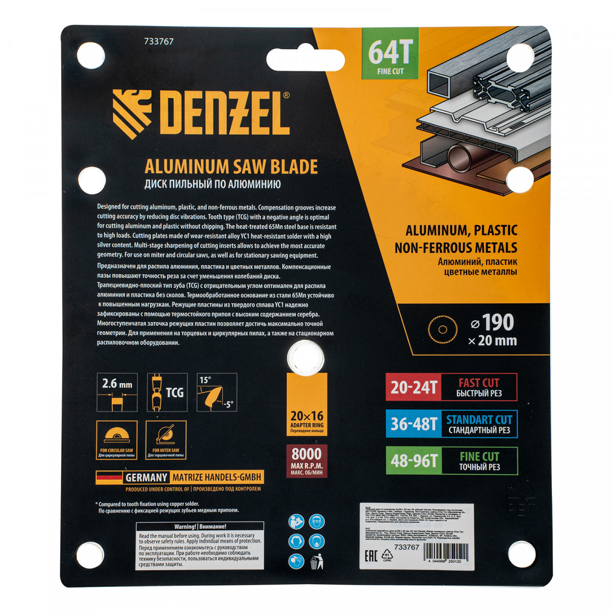 Пильный диск по алюминию ф190 х 20 мм, 64 зубьев Denzel