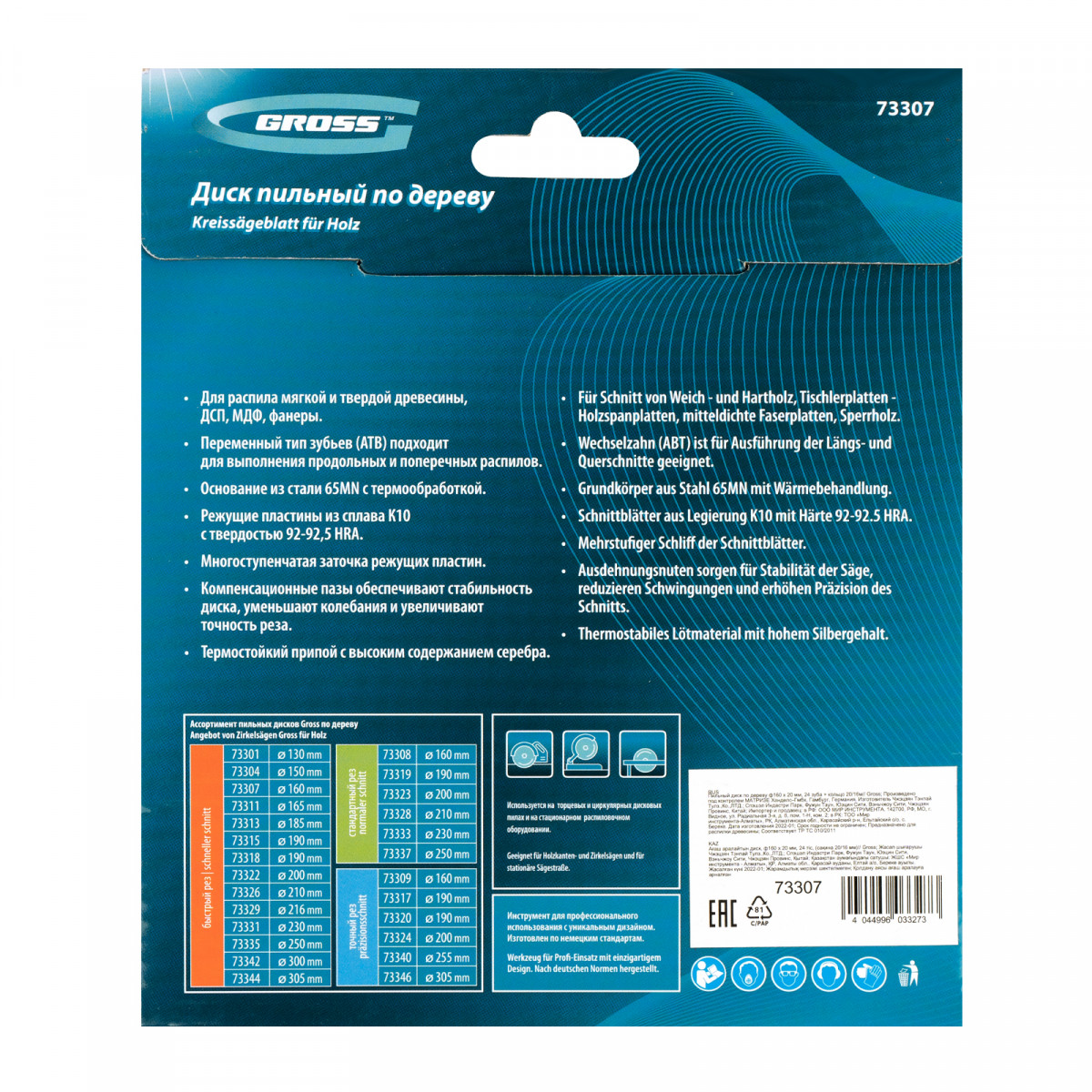 Пильный диск Gross 73307 диаметром 160 х 20 мм, с 24 зубьями и переходным кольцом 20/16 мм, предназначен для распила древесины мягких и твердых пород, ДСП, МДФ и фанеры. Используется в качестве оснастки для циркулярных и торцовочных пил с посадочным диаметром 20 мм, благодаря универсальному типу зубьев АТВ подходит как для продольного, так и для поперечного реза материалов. Диск изготовлен на высококачественном оборудовании, специально рассчитан на профессиональное применение и выполнение большого объема работ.
