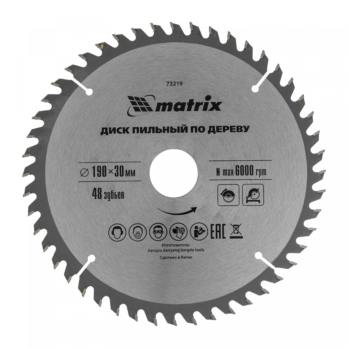 Пильный диск по дереву Matrix 73219 диаметром 190 х 30 мм, с 48 зубьями, — оснастка для циркулярных и торцовочных пил с соответствующим посадочным и внешним диаметром. Используется преимущественно для поперечного реза материалов из мягкой и твердой древесины, ДСП, ДВП, фанеры, столярных плит. Диск подходит для бытового и профессионального применения.