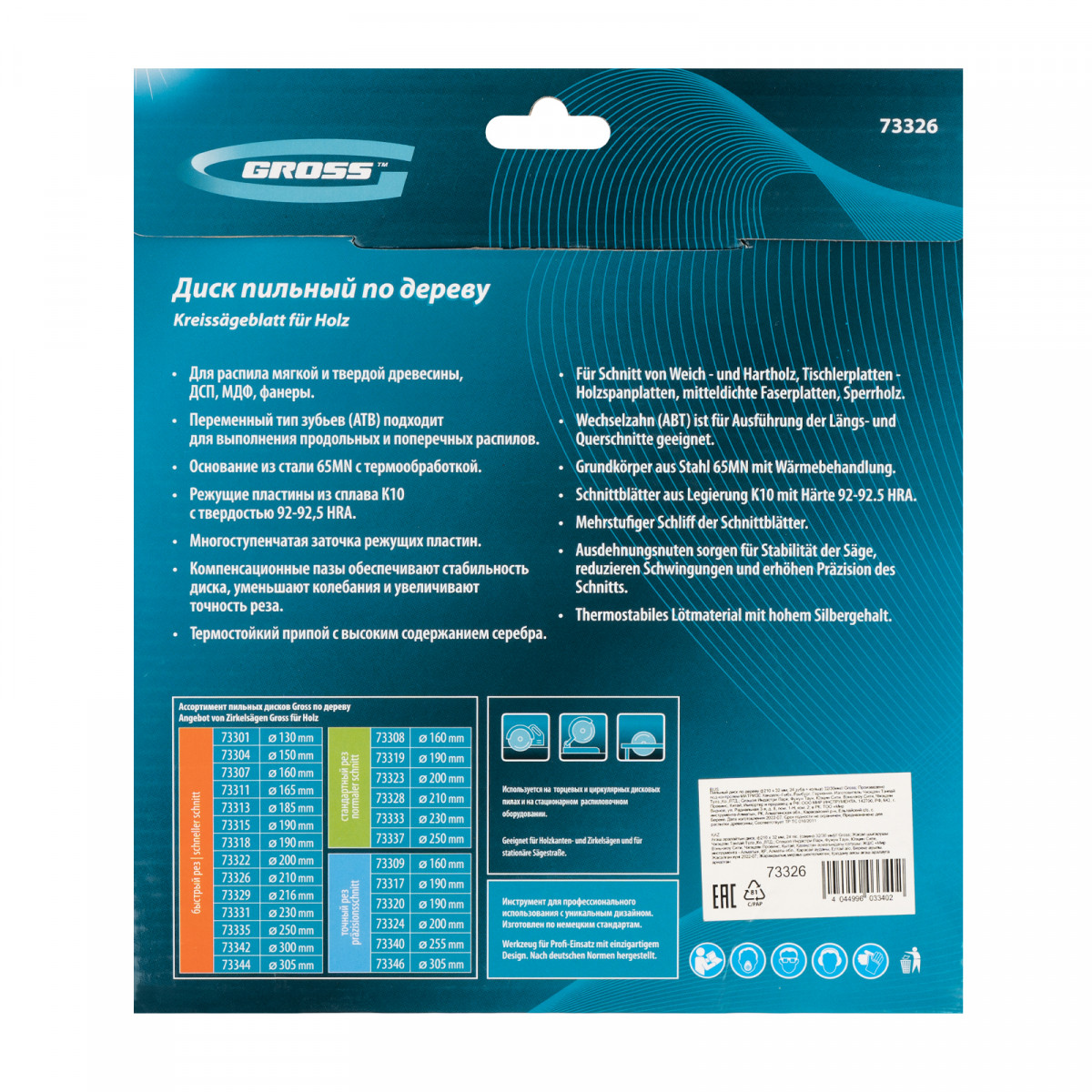 Пильный диск Gross 73326 диаметром 210 х 32 мм, с 24 зубьями и переходным кольцом 32/30 мм, предназначен для распила древесины мягких и твердых пород, ДСП, МДФ и фанеры. Используется в качестве оснастки для циркулярных и торцовочных пил с посадочным диаметром 32 мм, благодаря универсальному типу зубьев АТВ подходит как для продольного, так и для поперечного реза материалов. Диск изготовлен на высококачественном оборудовании, специально рассчитан на профессиональное применение и выполнение большого объема работ.