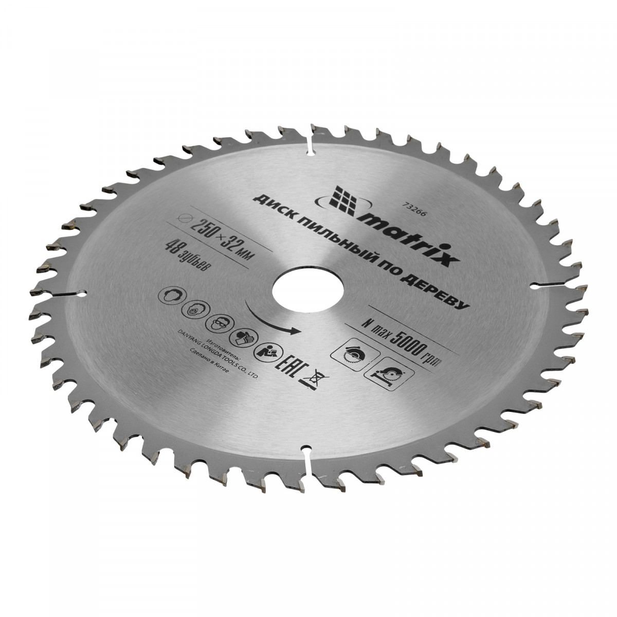 Пильный диск по дереву Matrix 73266 диаметром 250 х 32 мм, с 48 зубьями, — оснастка для циркулярных и торцовочных пил с соответствующим посадочным и внешним диаметром. Используется преимущественно для поперечного реза материалов из мягкой и твердой древесины, ДСП, ДВП, фанеры, столярных плит. Диск подходит для бытового и профессионального применения.