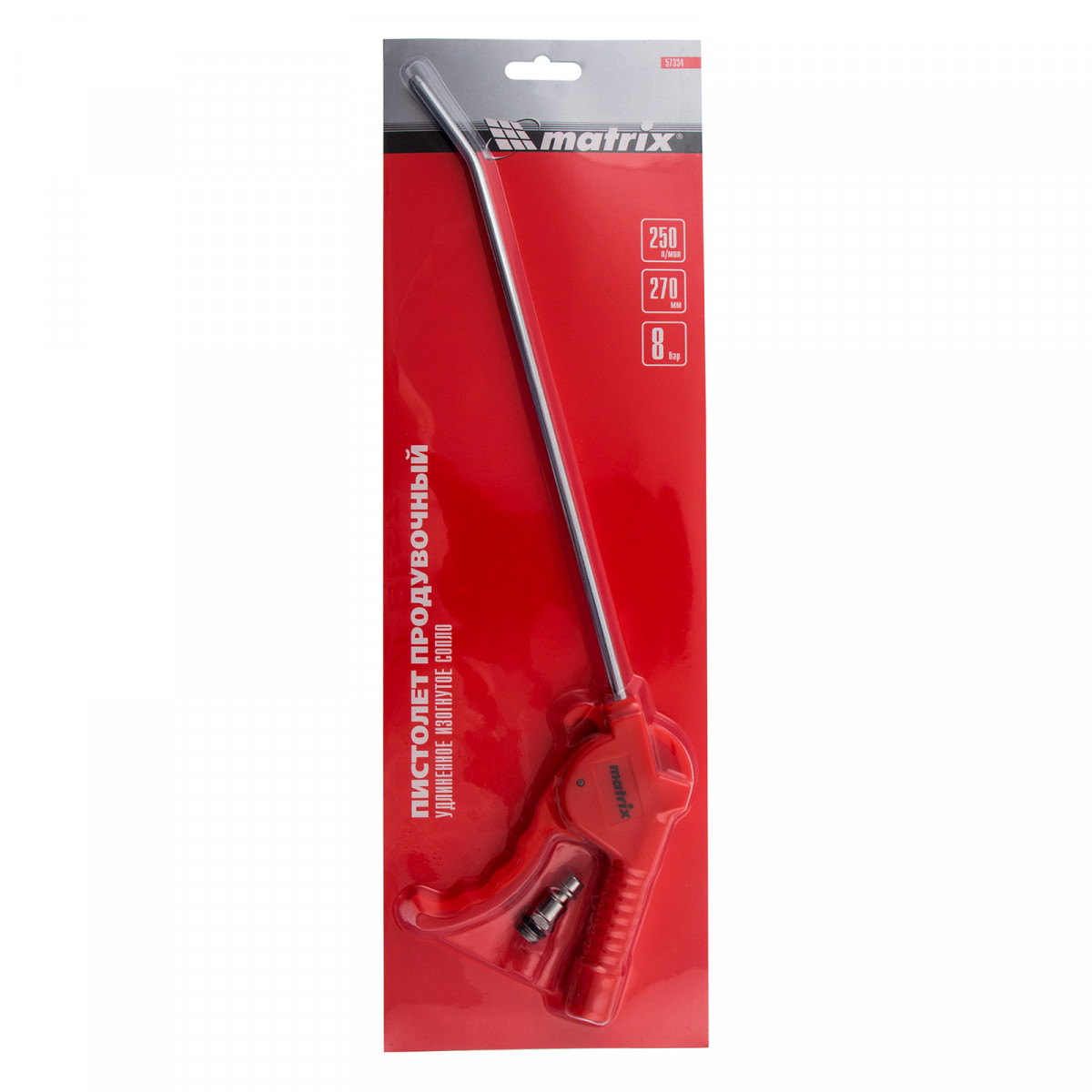 Пистолет продувочный Matrix 57334 с удлиненным изогнутым соплом длиной 270 мм подходит для применения в быту, в автосервисах, в небольших мастерских и на строительных объектах. С помощью потока сжатого до 8 бар воздуха эффективно очищает отверстия, шланги, пазы деталей и поверхности с производительностью до 270 л/час. Продувочный пистолет отличается высоким уровнем пожарной безопасности, поэтому может использоваться во влажных помещениях.