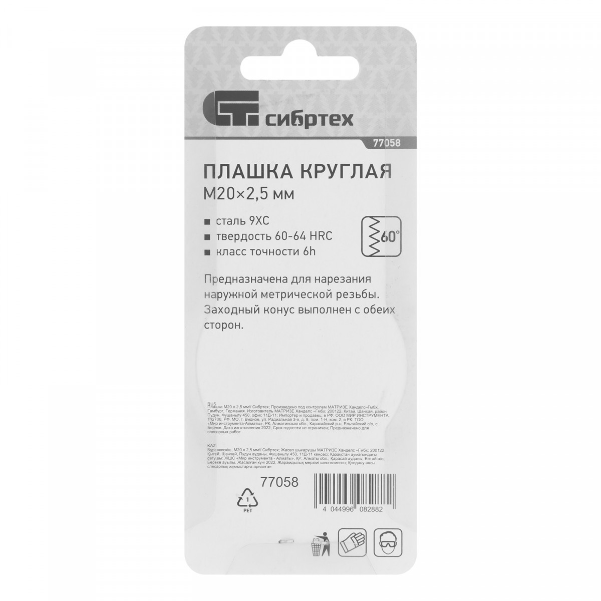 Плашка М20 х 2.5 мм Сибртех